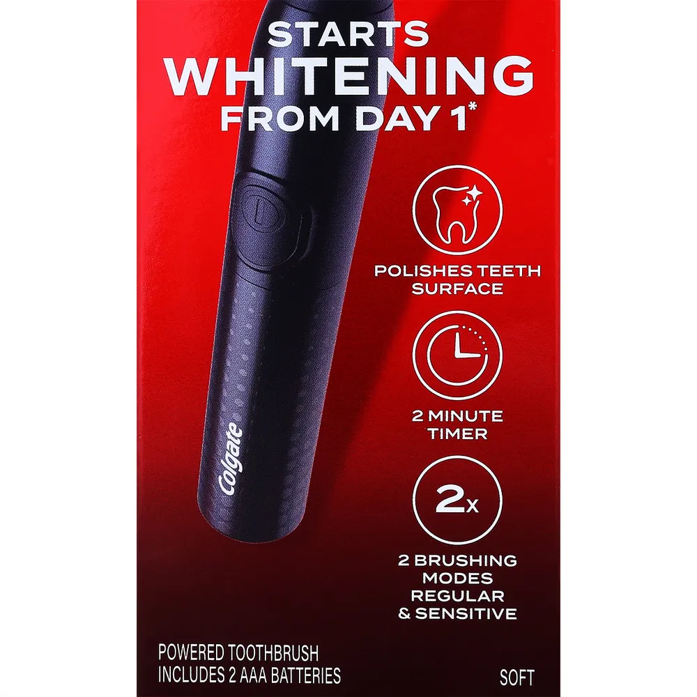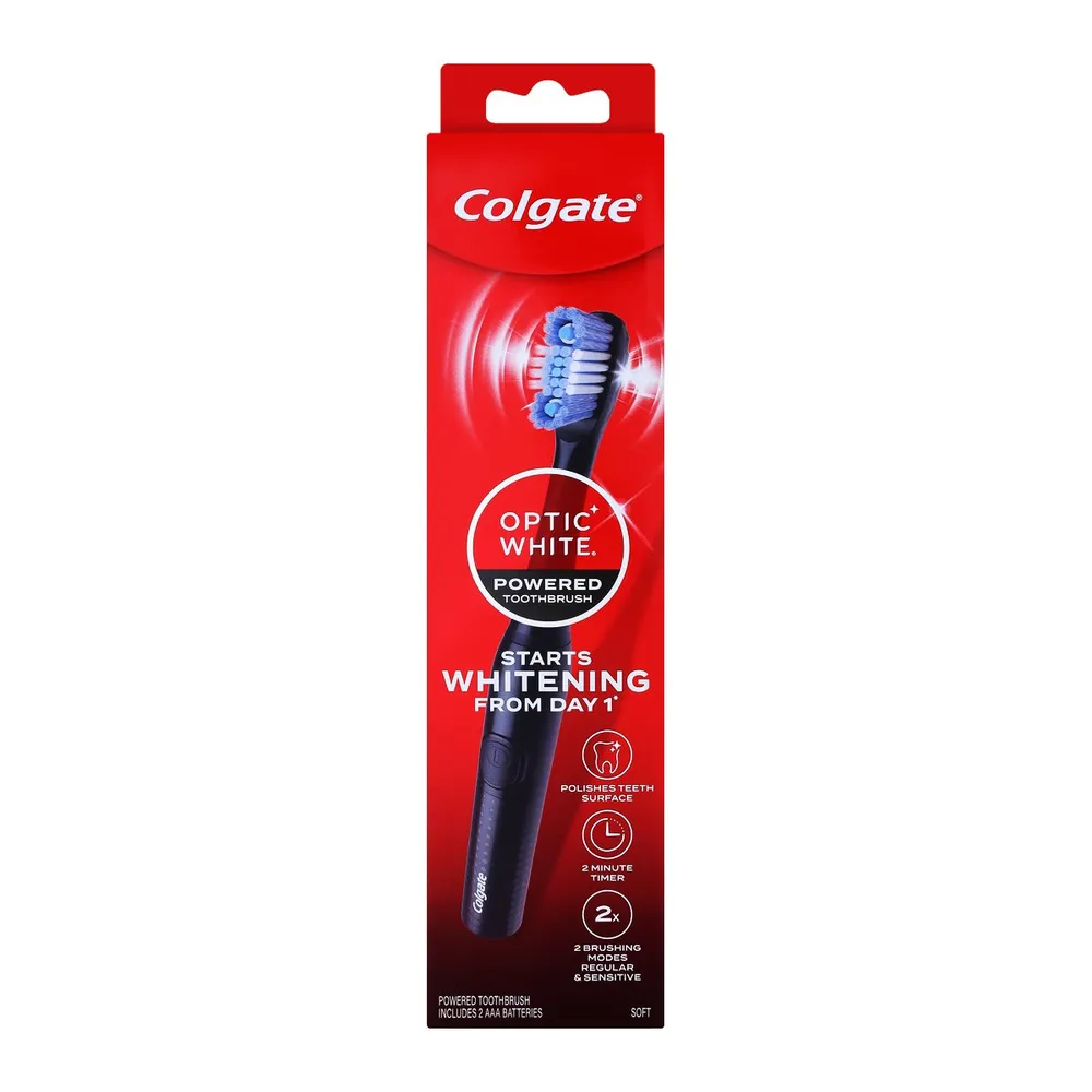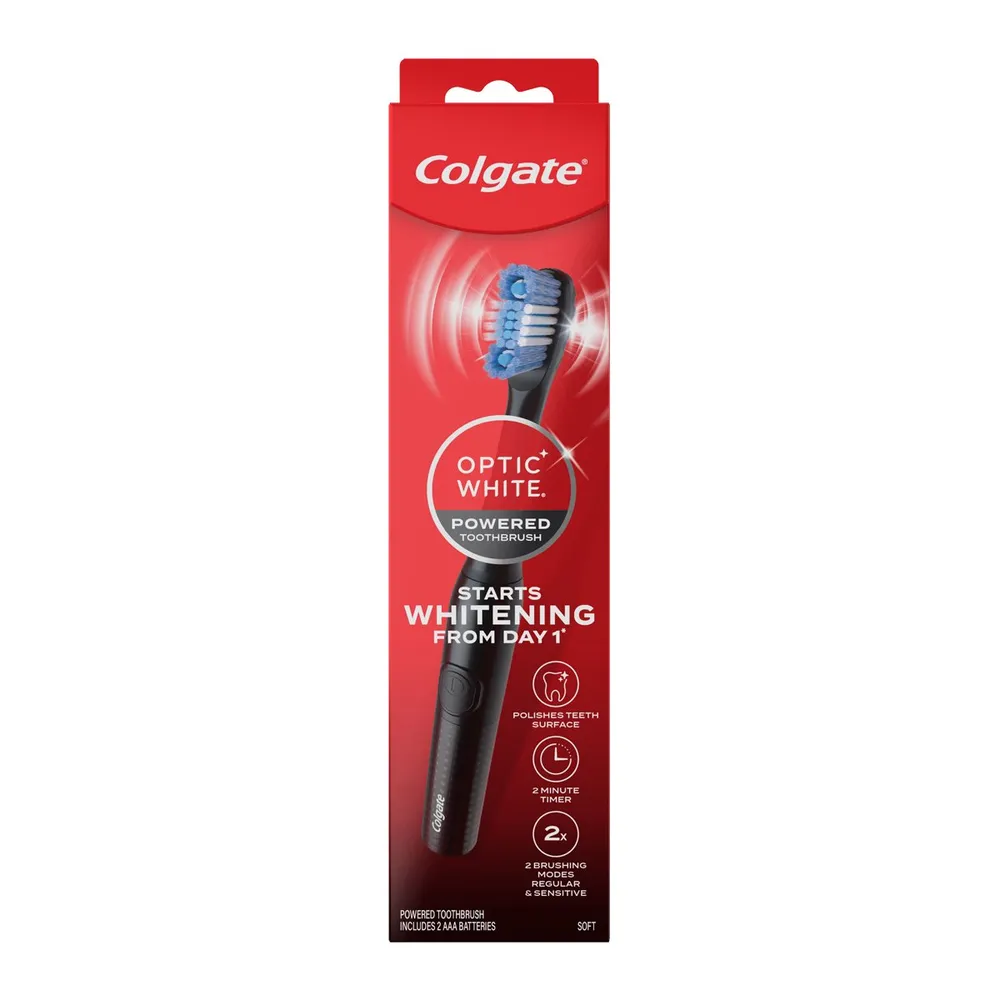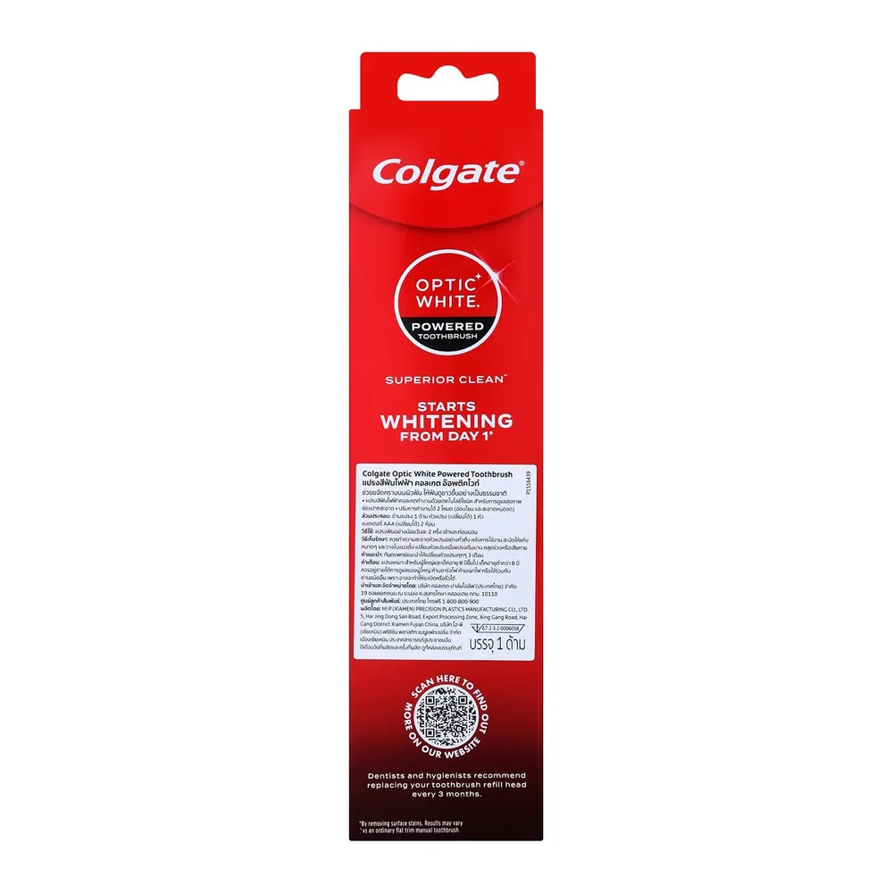 แปรงสีฟันไฟฟ้า คอลเกต ออฟติกไวท์ ช่วยให้ฟันดูขาวขึ้นตั้งแต่วันแรกที่ใช้ด้วยเทคโนโลยีโซนิค ขนแปรงบิดเกลียว พร้อมยางทรงกลมช่วยขจัดคราบบนผิวฟัน ช่วยขจัดคราบบนผิวฟัน ผลลัพธ์ขึ้นอยู่กับแต่ละบุคคล<br />