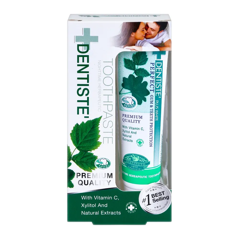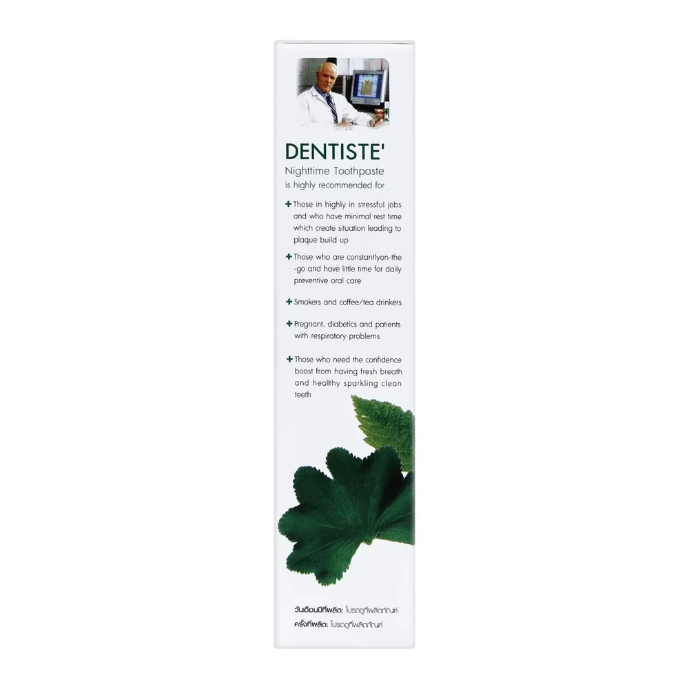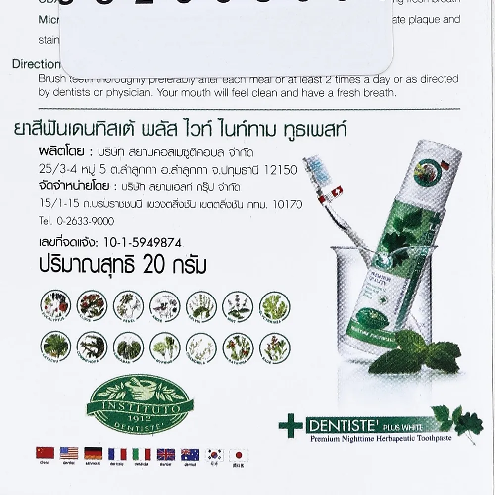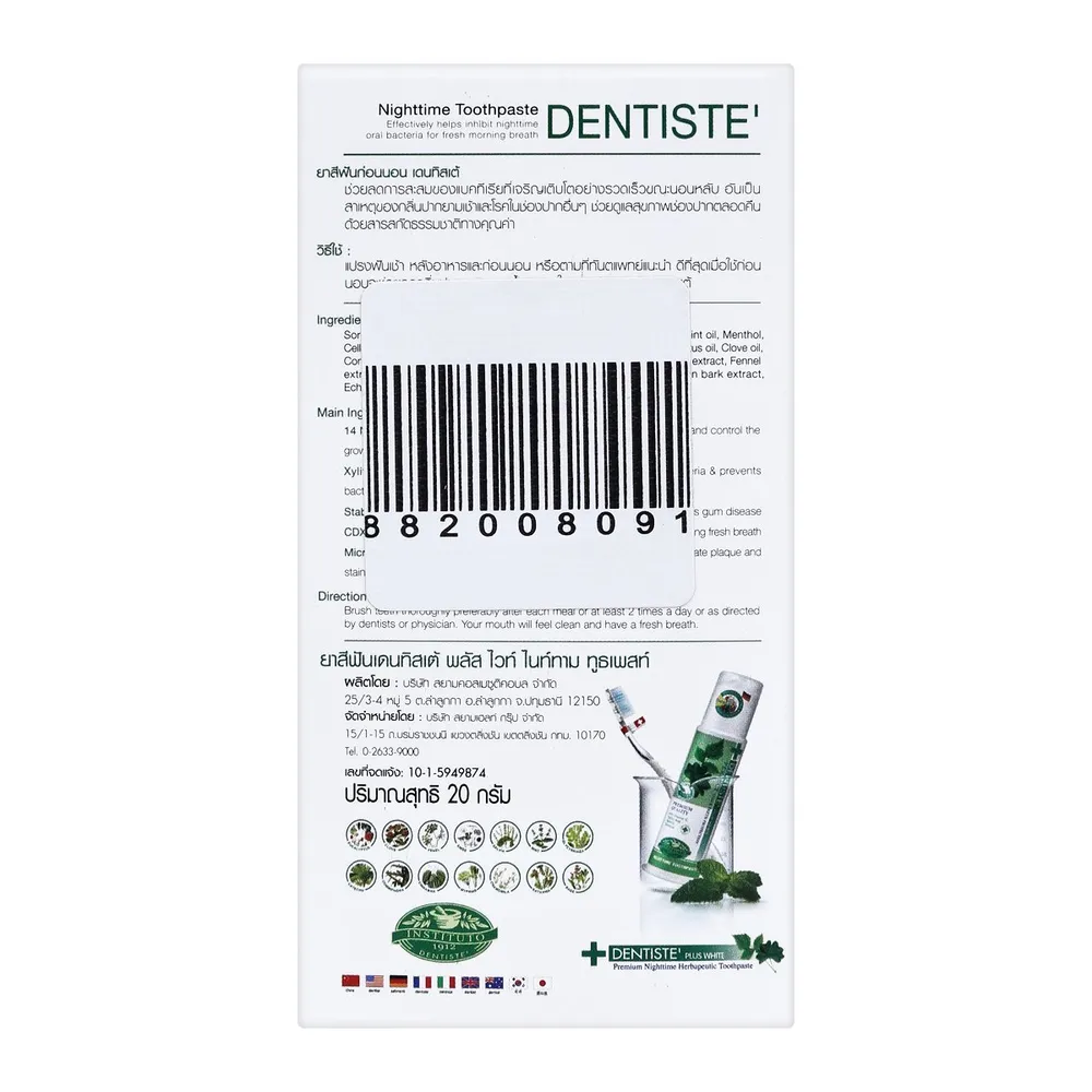 <p>เดนทิสเต้ ยาสีฟัน พลัสไวท์ ขนาด 20 ก. <br /><br />เดนทิสเต้ ยาสีฟัน พลัสไวท์ เดนทิสเต้ พลัสไวท์ ไนท์ไทม์ เฮอร์บาพิวติก ยาสีฟันพรีเมี่ยม ช่วยลดการสะสมของแบคทีเรียใน ช่องปาก ขณะหลับให้คุณตื่นมาพร้อมลมหายใจสะอาดสดชื่นทุกเช้า และช่วยลดการเกิดแบคทีเรียในช่องปาก<br /><br />- เดนทิสเต้ พลัสไวท์ ไนท์ไทม์ เฮอร์บาพิวติก ทูสเพส ยาสีฟันก่อนนอนระดับพรีเมี่ยม <br />- ทำความสะอาดเหงือกและฟันอย่างเข้าถึง<br />- ช่วยลดการสะสมของแบคทีเรีย ขณะหลับให้คุณตื่นมาพร้อมลมหายใจสะอาดสดชื่นทุกเช้า <br /><br />*ภาพประกอบใช้เพื่อการโฆษณาเท่านั้น</p>