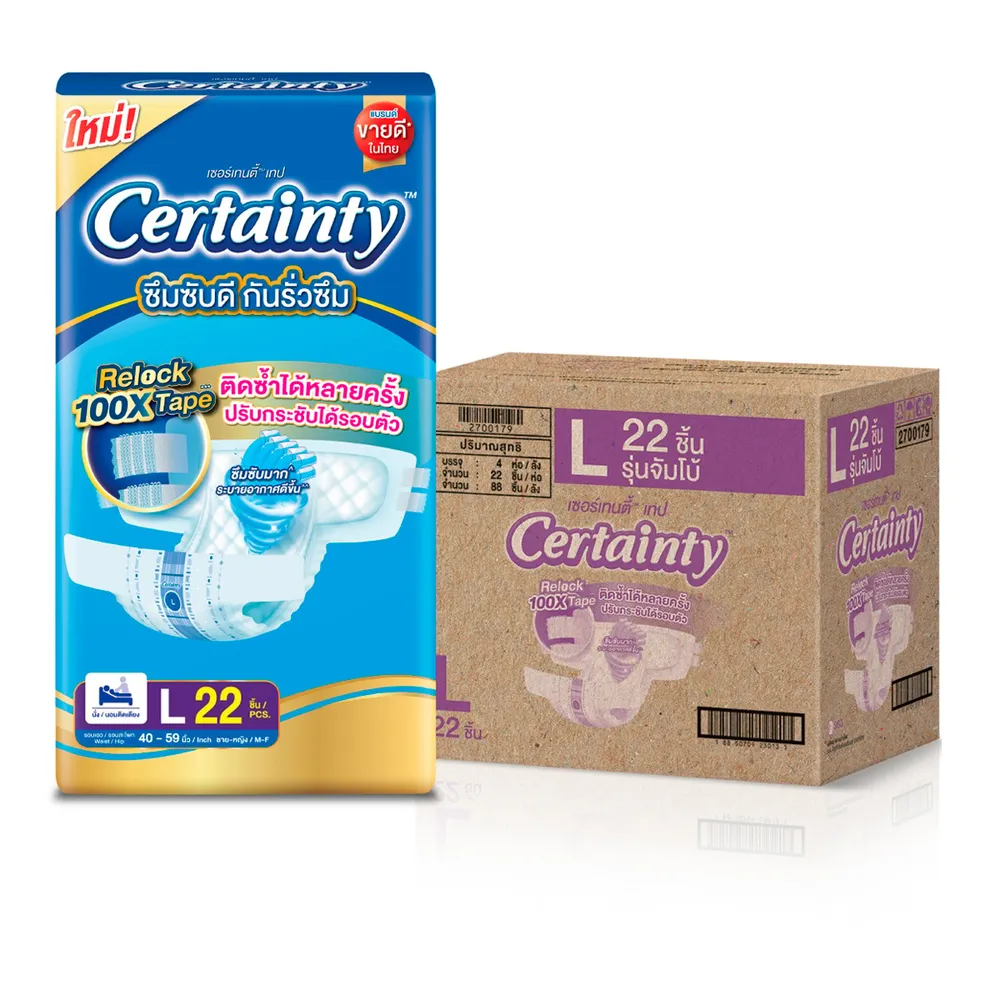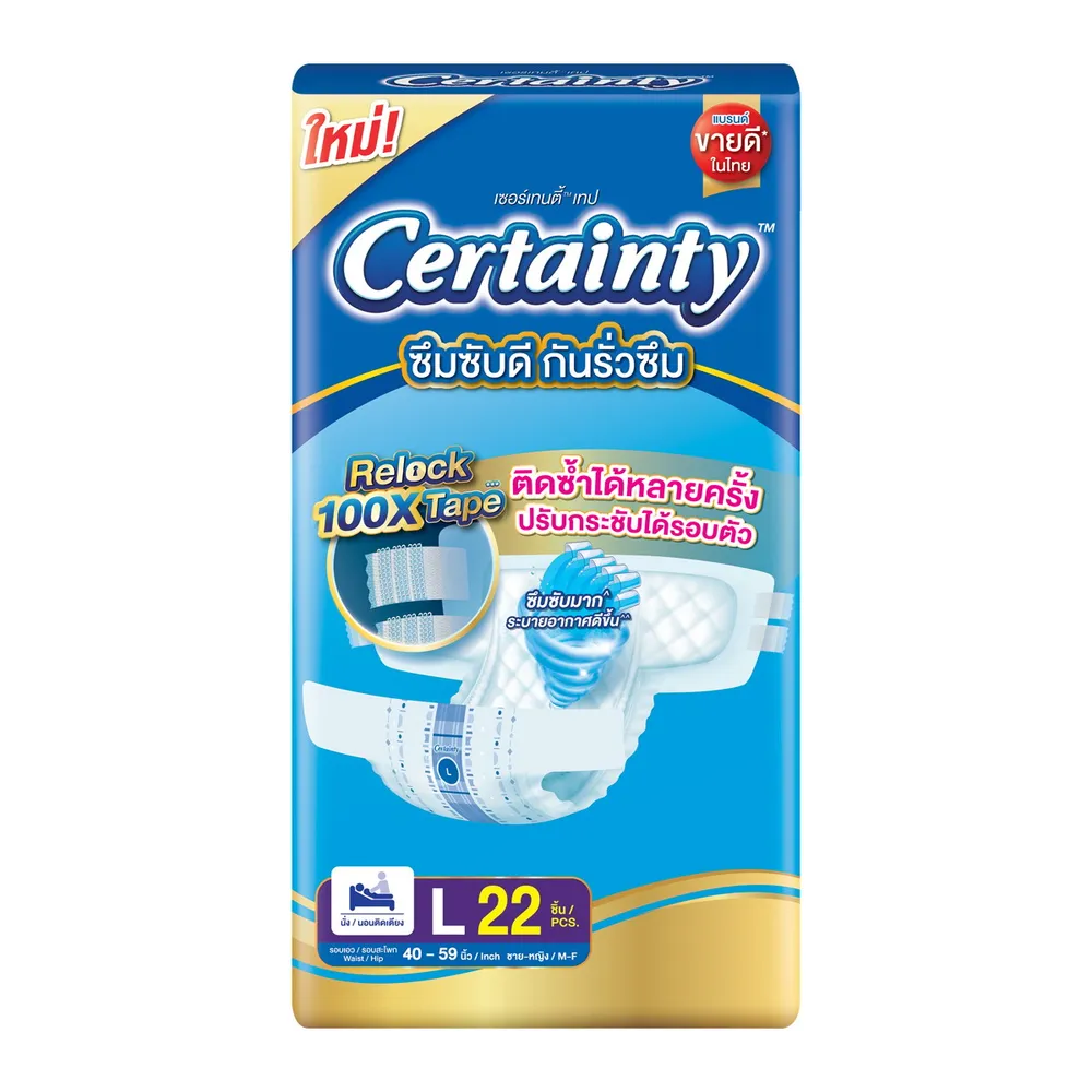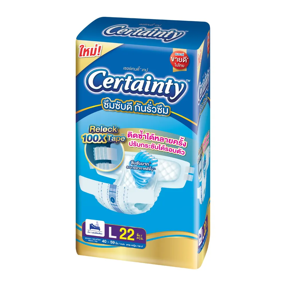 ผ้าอ้อมผู้ใหญ่เซอร์เทนตี้แบบเทป แบรนด์ขายดีในไทย ที่ซึมซับดี แห้งสบาย เหมาะสำหรับผู้ที่นอนติดเตียง เคลื่อนไหวไม่สะดวก และต้องการการซึมซับสูง สะดวก ใช้ง่าย ซึมซับมั่นใจ<br />