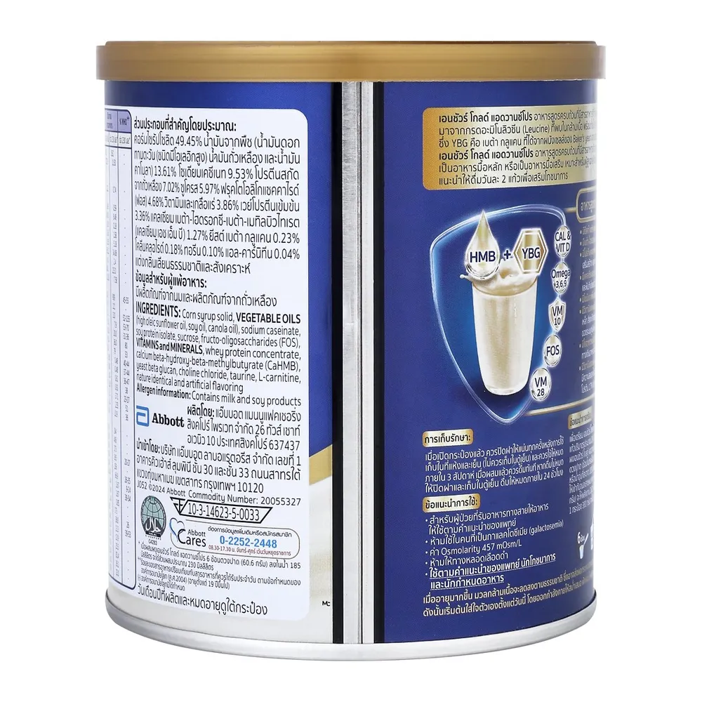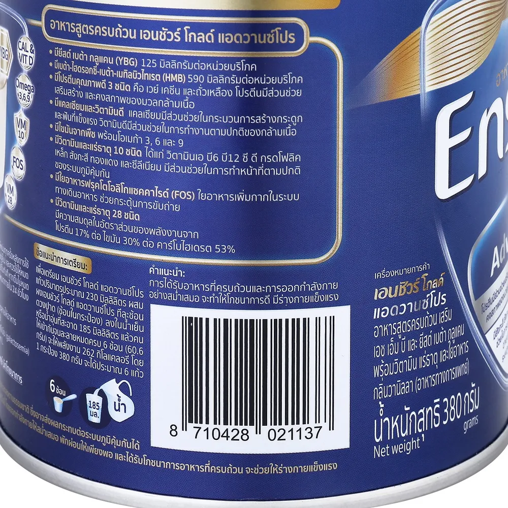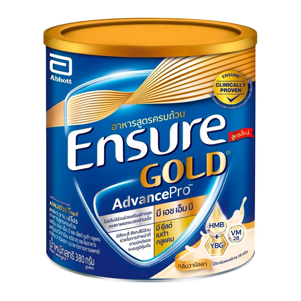 เอนชัวร์ โกลด์ อาหารสูตรครบถ้วนเสริม เอชเอ็มบี พร้อมวิตามิน แร่ธาตุ และใยอาหาร กลิ่นวานิลลา สูตรน้ำตาลลดลง 18% ถือเป็นอาหารทางการแพทย์ที่ดื่มง่ายรสชาติกลมกล่อมอร่อยถูกปาก โดยควรบริโภคในปริมาณที่เหมาะสมเพื่อให้ร่างกายดูดซึมและนำไปใช้งานได้อย่างเต็มประสิทธิภาพ<br />