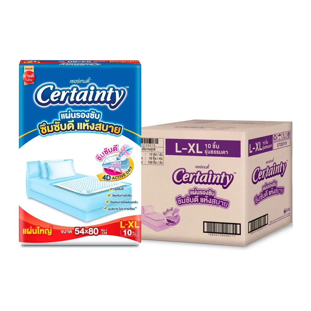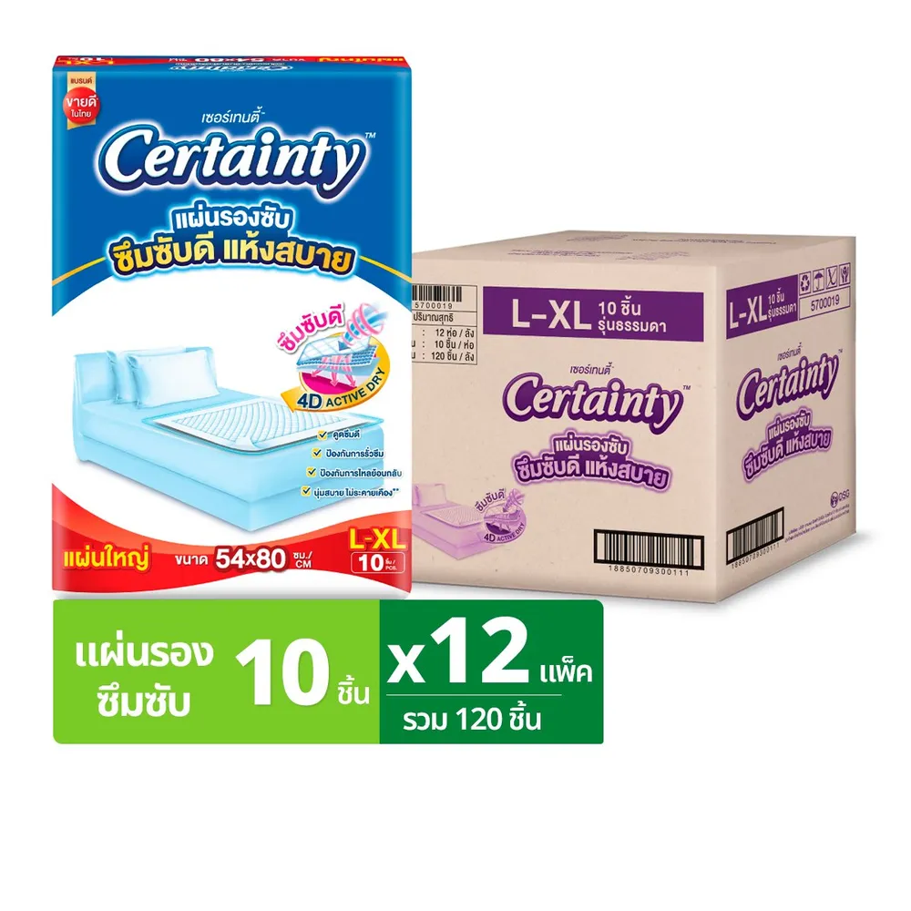 <p>เซอร์เทนตี้ แผ่นรองซับ ขนาด L-XL 10 ชิ้น แพ็ค 12 ถุง<br />