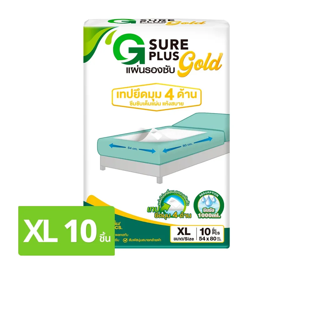 จีชัวร์ พลัส แผ่นรองซับ โกล์ด ไซส์ XL 10 ชิ้น