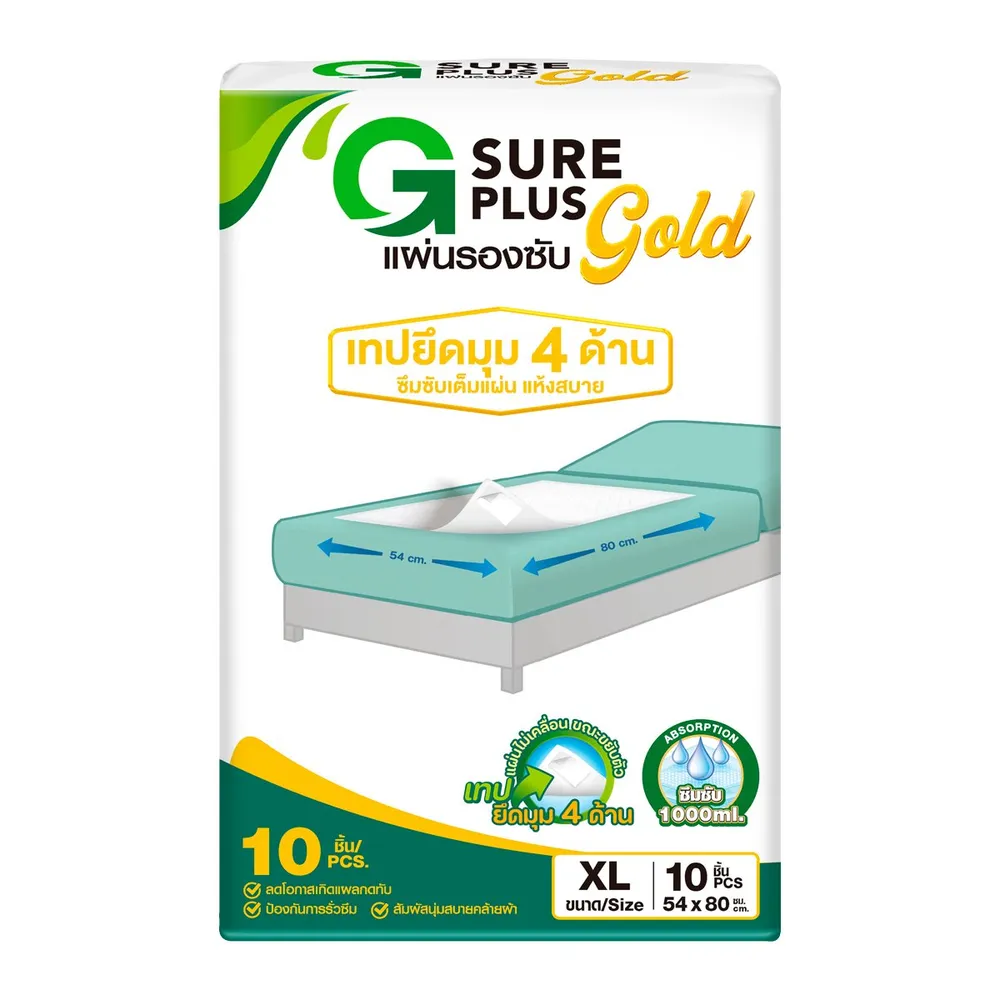 จีชัวร์พลัส แผ่นรองซับ โกล์ด ไซส์ XL ขนาด 54 x 80 ซม. เทปยึดมุม 4 ด้าน ซึมซับเร็ว แห้งสบาย แผ่นไม่เคลื่อน ขณะขยับตัว<br />