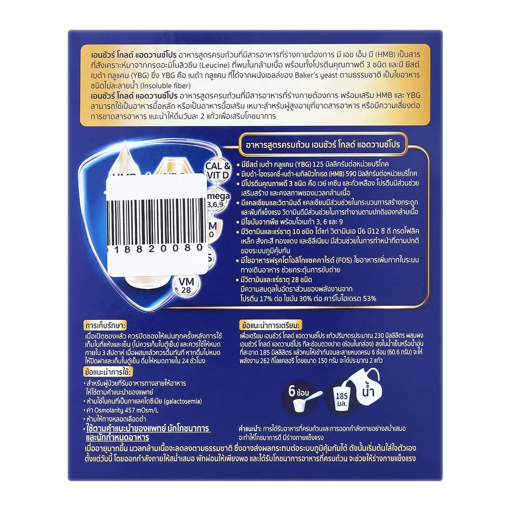 เอนชัวร์ โกลด์ อาหารสูตรครบถ้วนเสริม เอช เอ็ม บี กลิ่นวานิลลา เอนชัวร์อาหารทางการแพทย์ ที่ให้สารอาหารที่ร่างกายต้องการ มีสารอาหารครบถ้วน เพื่อเสริมสร้างคุณประโยชน์ทางโภชนาการให้กับร่างกาย เหมาะสำหรับผู้สูงอายุที่มีภาวะทุพโภชนาการ หรือมีความเสี่ยงต่อการเกิดภาวะทุพโภชนาการ<br />