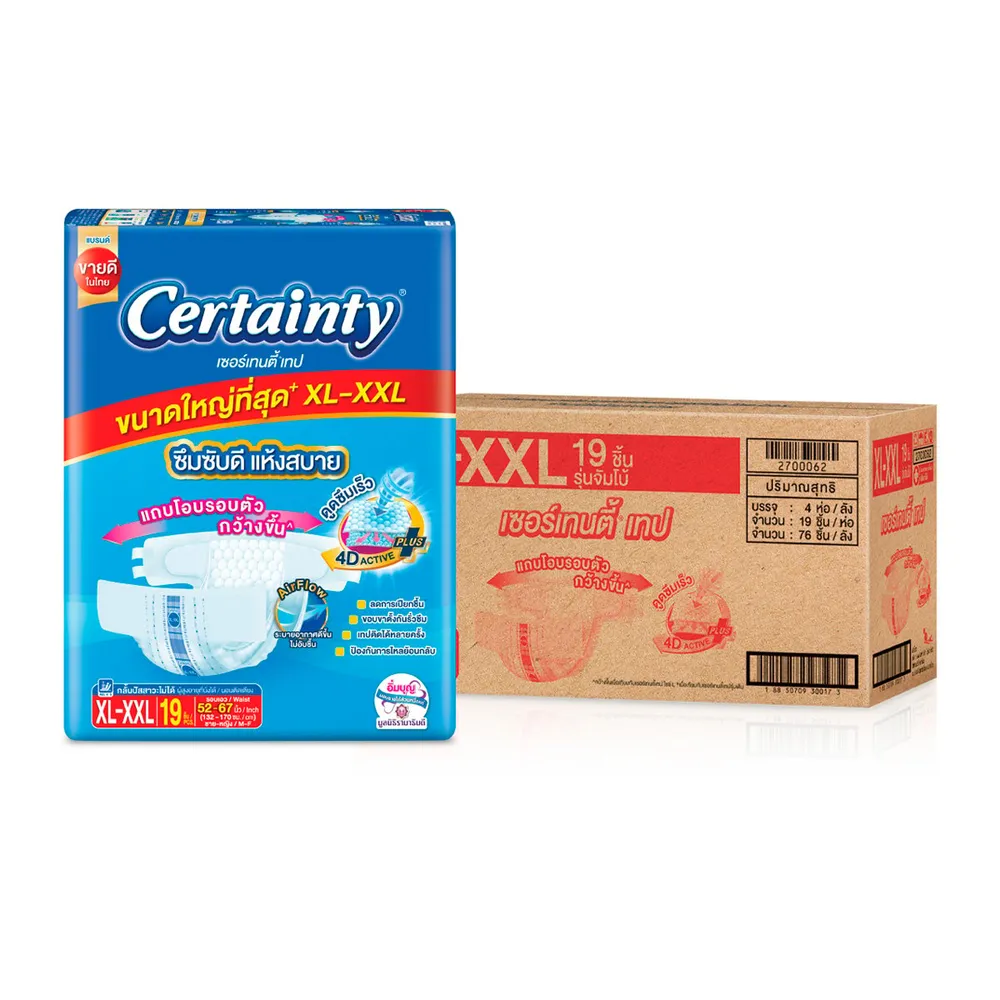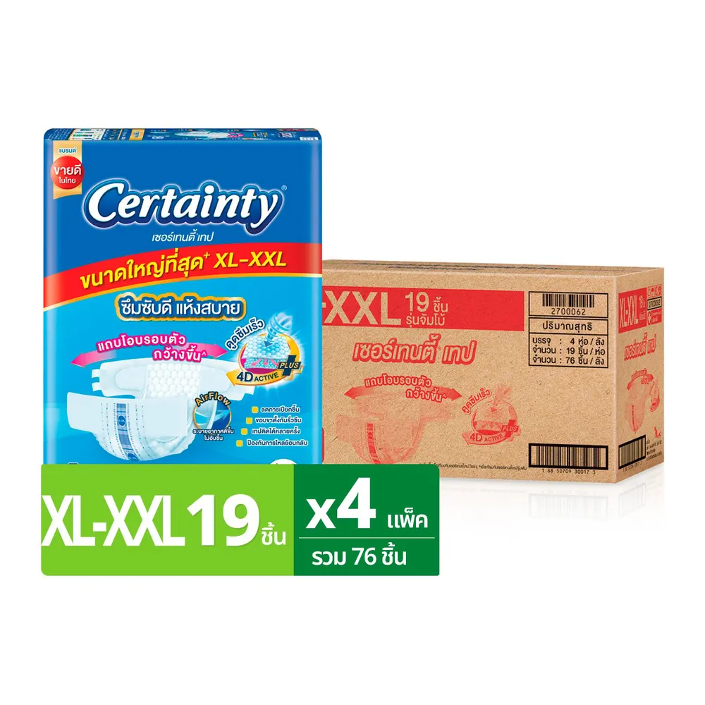 เซอร์เทนตี้ ผ้าอ้อมผู้ใหญ่ชนิดเทป จัมโบ้ แพ็ค ไซส์ XL-XXL 19 ชิ้น แพ็ค 4