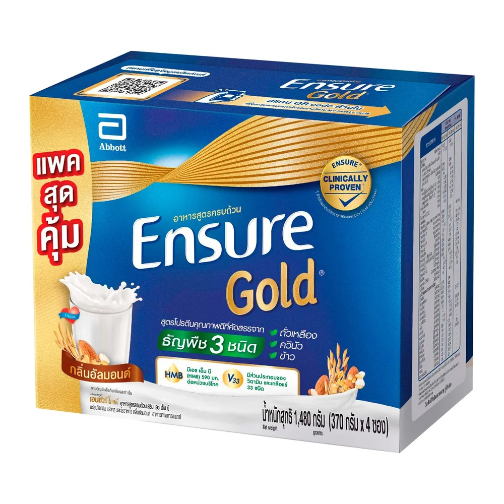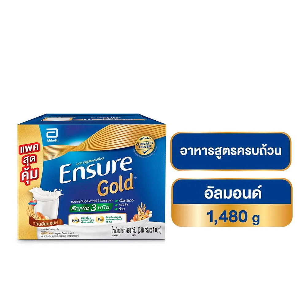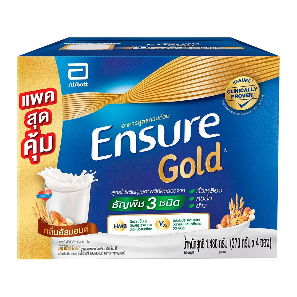 - เอนชัวร์ โกลด์ อาหารสูตรครบถ้วน สูตรโปรตีนจากธัญพืช 3 ชนิด ผสมวิตามินและเกลือแร่ กลิ่นอัลมอนด์<br />