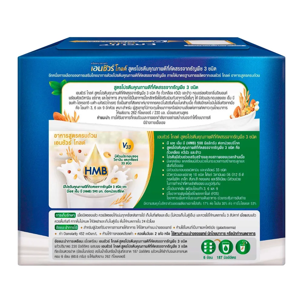 เอนชัวร์ โกลด์ อาหารสูตรครบถ้วน สูตรโปรตีนคุณภาพดีที่คัดสรรจากธัญพืช 3 ชนิด (พืช 100%) อีกหนึ่งทางเลือกของการเสริมโภชนาการด้วยอาหารสูตรครบถ้วน เสริม เอช เอ็ม บี พร้อมวิตามิน แร่ธาตุ และใยอาหาร<br />