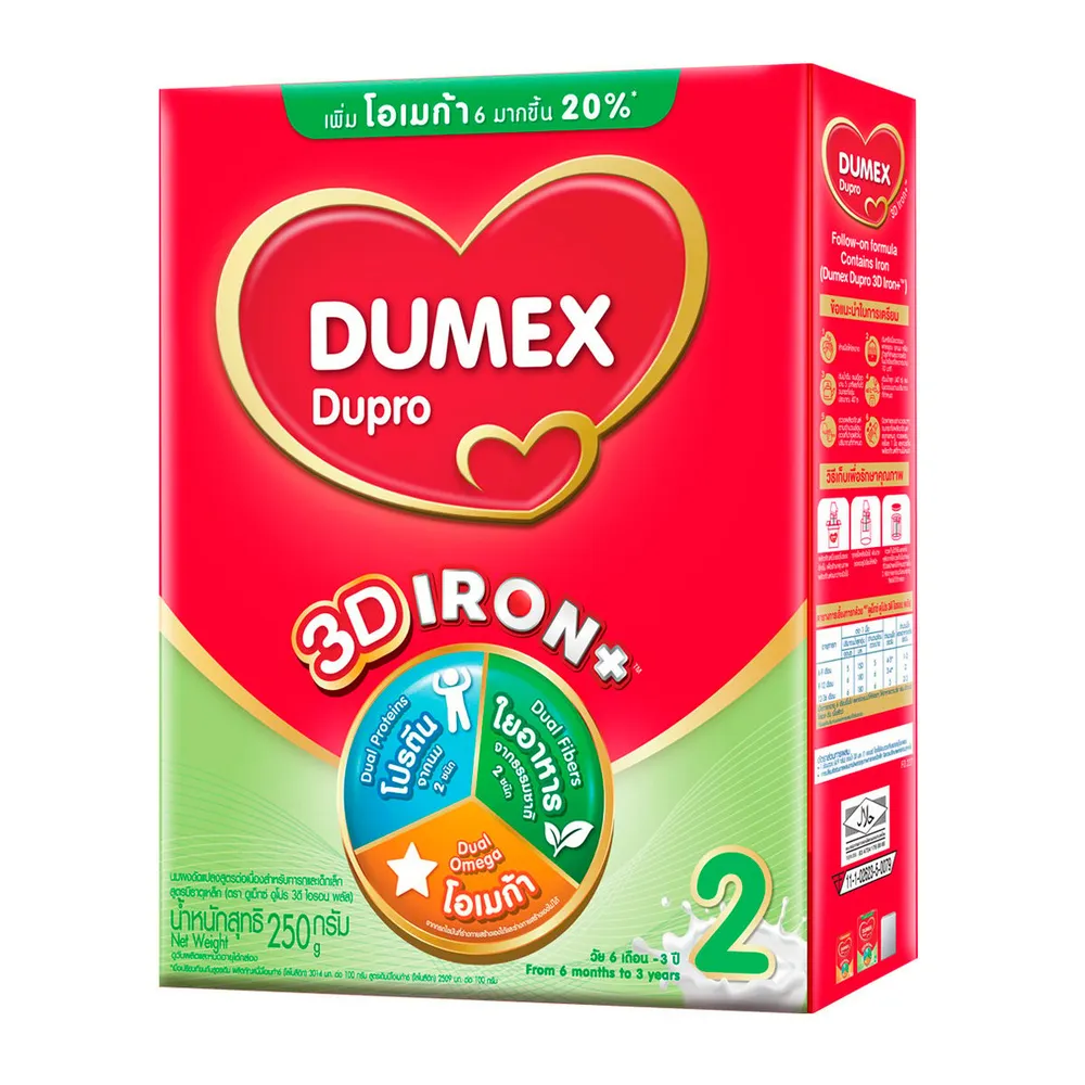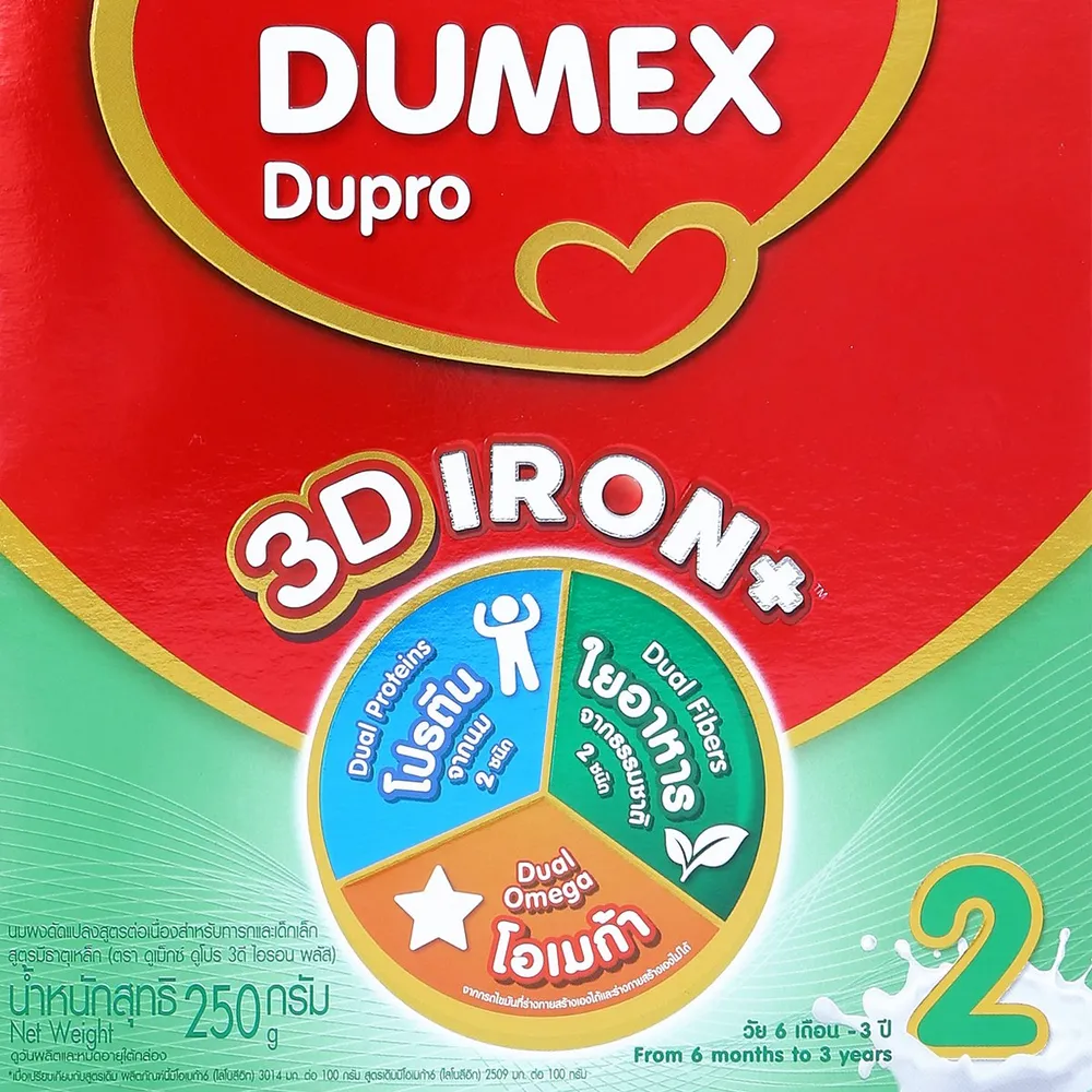 - ดูเม็กซ์ ดูโปร นมผงดัดแปลงสำหรับทารกและเด็กเล็ก สูตรมีธาตุเหล็ก สำหรับช่วงวัยที่ 2 ตั้งแต่เด็กอายุ 6 เดือน ถึงอายุ 3 ปี<br />