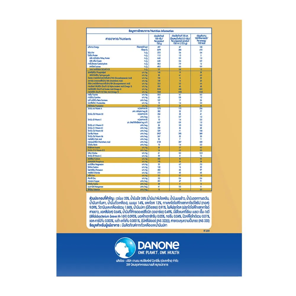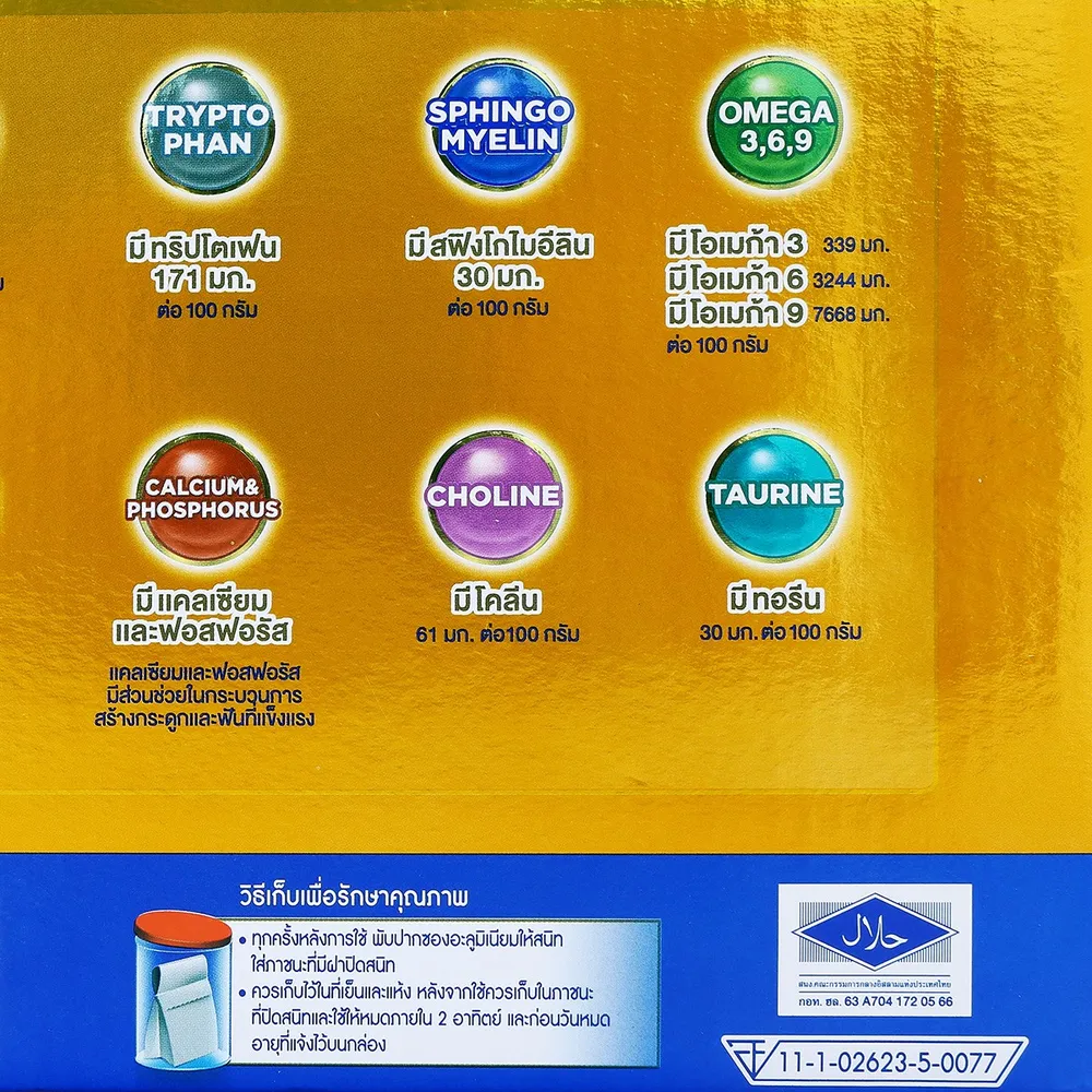 ส่วนประกอบที่สำคัญ: ผงเวย์ 35%, น้ำมันพืชผสม 25.7% (น้ำมันปาล์มโอเลอิน, น้ำมันมะพร้าว, น้ำมันดอกทานตะวัน, น้ำมันคาโนลา, น้ำมันถั่วเหลือง), นมผง 13.7%, แลคโตส 11.8%, กาแลคโตโอลิโกแซกคาไรด์ไซรัป (กอส) 9.09%, วิตามินและเกลือแร่รวม 1.86%, น้ำมันปลา (มีดีเอชเอ) 0.91%, โพลีฟรุกโตส (ฟรุกโตโอลิโกแซกคาไรด์ สายยาว, แอลซีฟอส) 0.64%, น้ำมันที่ให้กรดอะแรชิโดนิก (เออาร์เอ) 0.49%, 2&#39;-ฟูโคซิลแลคโตส 0.45%, บิฟิโดแบคทีเรียม เบรเว เอ็ม-16วี 0.095%, มอลโทเดกซ์ทริน 0.05%, ทอรีน 0.04%, นิวคลีโอไทด์รวม 0.01%, แอล-คาร์นิทีน 0.003%, เบต้า-แคโรทีน 0.0001%, อิมัลซิไฟเออร์ (INS 322(i)), สารควบคุมความเป็นกรด (INS 330) <br />
