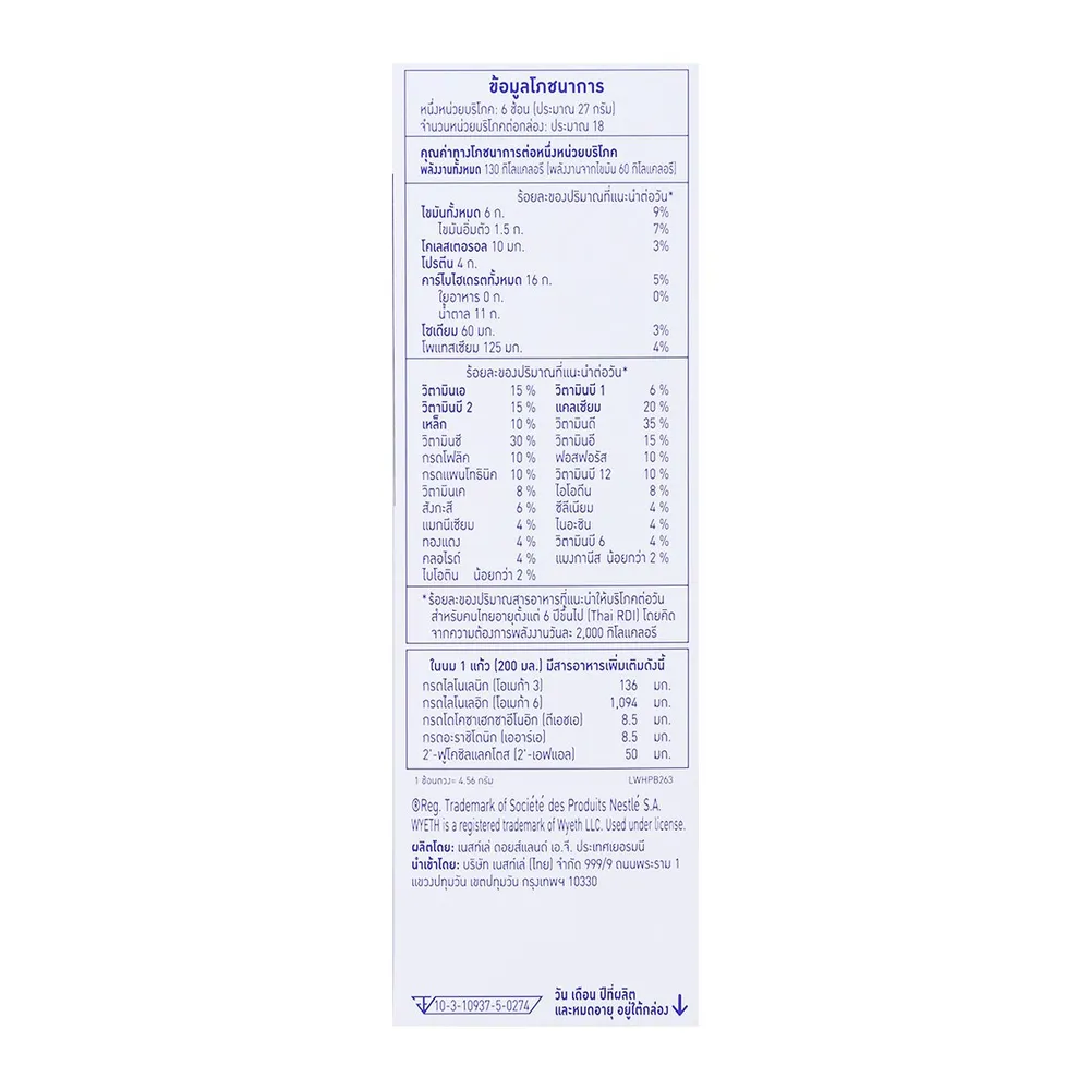- ใน 1 แก้วมีสารอาหารเช่น โอลิโกแซคคาไรด์ HMOs (ใยอาหารชนิด 2&#39;-FL), โพรไบโอติกบีแล็กทิส, ดีเอชเอ, เหล็ก และวิตามินเอ เป็นต้น<br />