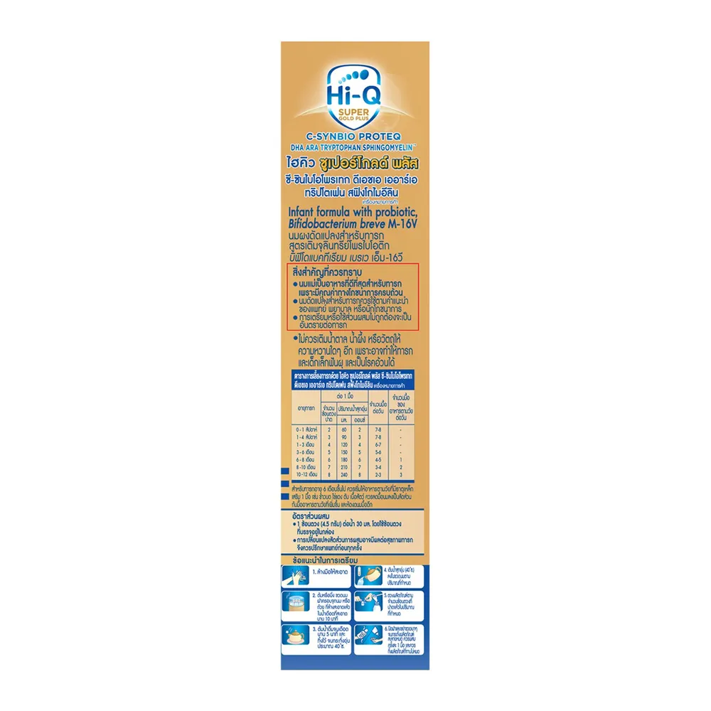 ไฮคิว ซูเปอร์โกลด์ พลัส ซี-ซินไบโอโพรเทก สูตร 1 นมผงดัดแปลงสำหรับทารกที่เพิ่มปริมาณจุลินทรียโพรไบโอติก บิฟิโดแบคเรียม เบรเว เอ็ม-16วี 12 เท่า ช่วยเสริมสร้างพัฒนาการที่ดี พร้อมให้ลูกน้อยเติบโตอย่างมั่นใจ และนมแม่ดีที่สุดสำหรับทารก<br />