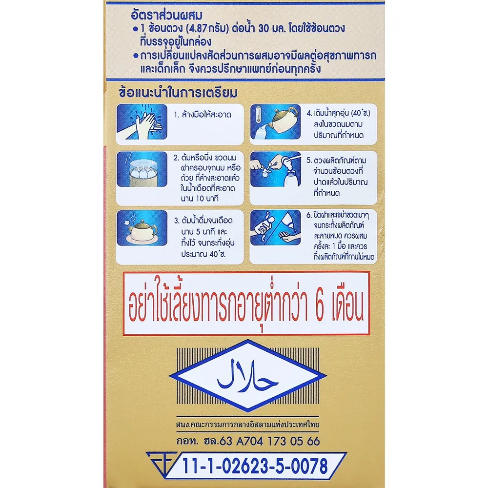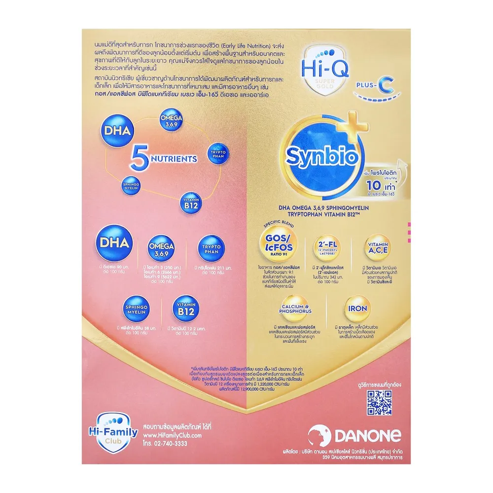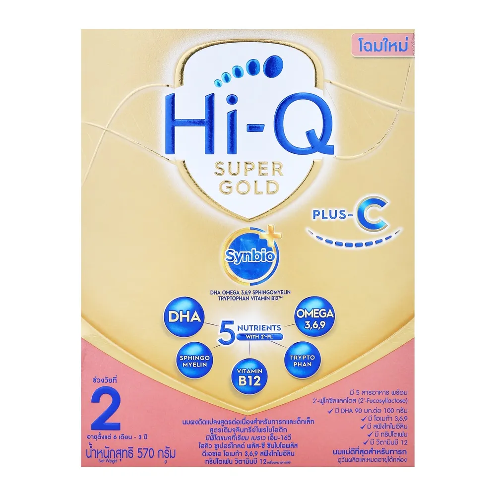 <p>ไฮคิว ซูเปอร์โกลด์ พลัส ซี-ซินไบโอ โพรเทก คิว ช่วงวัยที่ 2<br /> <br /> เตรียมพื้นฐานร่างกายให้ลูกน้อยแข็งแรงพร้อมก้าวข้ามทุกอุปสรรค ไปกับไฮคิว ซูเปอร์โกลด์ พลัส ซี-ซินไบโอ โพรเทก คิว ที่มีสารอาหารสำคัญสำหรับพัฒนาการ เพื่อสร้างพื้นฐานสู่อนาคต<br /> <br /> - นมดัดแปลงสูตรต่อเนื่องสำหรับทารกและเด็กเล็กวัย 6 เดือน - 3 ปี<br /> - หนึ่งเดียวที่มี ซินไบโอติก และ 2&rsquo;-FL เอกสิทธิ์เฉพาะ<br /> - พัฒนาให้ดียิ่งขึ้น เพิ่มจุลินทรีย์โพรไบโอติก บิฟิโดแบคทีเรียม เบรเว เอ็ม-16วี ถึง 9 เท่า<br /> - อุดมไปด้วยสารอาหารที่จำเป็นต่อการเจริญเติบโตตามช่วงวัย อาทิเช่น โอเมก้า 3,6,9 / วิตามินเอ ซี อี และบี 12 เป็นต้น<br /> - นมแม่นั้นดีที่สุดสำหรับทารก<br /> <br /> ส่วนประกอบที่สำคัญ: ผงเวย์ 26%, นมผง 24%, น้ำมันพืชผสม 19% (น้ำมันปาล์มโอเลอิน, น้ำมันมะพร้าว, น้ำมันดอกทานตะวัน, น้ำมันถั่วเหลือง, น้ำมันคาโนลา), แลคโตส 18%, กาแลคโตโอลิโกแซกคาไรด์ไซรัป (กอส) 8.38%, วิตามินและเกลือแร่รวม 1.66%, น้ำมันปลา (มีดีเอชเอ) 0.8%, โพลีฟรุกโตส (ฟรุกโตโอลิโกแซกคาไรด์ สายยาว, แอลซีฟอส) 0.58%, น้ำมันที่ให้กรดอะแรชิโดนิก (เออาร์เอ) 0.5%, 2&#39;-ฟูโคซิลแลคโตส 0.4%, บิฟิโดแบคทีเรียม เบรเว เอ็ม-16วี 0.2%, มอลโทเดกซ์ทริน 0.04%, ทอรีน 0.04%, นิวคลีโอไทด์รวม 0.01%, แอล-คาร์นิทีน 0.001%, เบต้า-แคโรทีน 0.0001%, อิมัลซิไฟเออร์ (INS 322(i)), สารควบคุมความเป็นกรด (INS 330)<br /> <br /> ข้อมูลสำหรับผู้แพ้อาหาร<br /> มีผลิตภัณฑ์จากถั่วเหลืองและน้ำมันปลา<br /> <br /> เลขที่ อย.<br /> 11-1-02623-5-0078<br /> <br /> สิ่งสำคัญที่ควรทราบ<br /> - นมแม่เป็นอาหารที่ดีที่สุดสำหรับทารก เพราะมีคุณค่าทางโภชนาการครบถ้วน<br /> - ควรใช้ผลิตภัณฑ์ตามคำแนะนำของแพทย์ พยาบาล หรือ นักโภชนาการ<br /> - ไม่ควรเติมน้ำตาล น้ำผึ้งหรือวัตถุให้ความหวานใดๆอีก เพราะอาจทำให้ทารกและเด็กเล็กฟันผุและเป็นโรคอ้วนได้<br /> - การเตรียมหรือใช้ส่วนผสมไม่ถูกต้อง จะเป็นอันตรายต่อทารก <br /> - อย่าใช้เลี้ยงทารกอายุต่ำกว่า 6 เดือน<br /> <br /> การให้ข้อมูลเกี่ยวกับอาหารสำหรับทารก ณ จุดจำหน่าย ตามประกาศกระทรวงสาธารณสุข เรื่องหลักเกณฑ์ วิธีการ เงื่อนไข รายละเอียดการจัดทำข้อมูล และช่องทางในการให้ข้อมูลเกี่ยวกับอาหารสำหรับทารก พ.ศ. 2561<br /> - สำหรับทารกอายุตั้งแต่ 6 เดือนขึ้นไป ทารกควรได้รับอาหารตามวัยควบคู่กับนมแม่แต่ในกรณีที่ต้องใช้นมผงชนิดนี้เลี้ยงทารกควรคำนึงถึงผลกระทบด้านค่าใช้จ่าย รวมทั้งผลเสียต่อสุขภาพ ที่อาจเกิดจากการเตรียมและการใช้อย่างไม่ถูกต้องและไม่เป็นไปตามคำแนะนำ ซึ่งอาจทำให้ทารกเจ็บป่วยได้<br /> <br /> ข้อควรระวังจากการเตรียมหรือการใช้อาหารสำหรับทารก<br /> - ผลิตภัณฑ์ชนิดนี้ควรเตรียม เก็บรักษา และใช