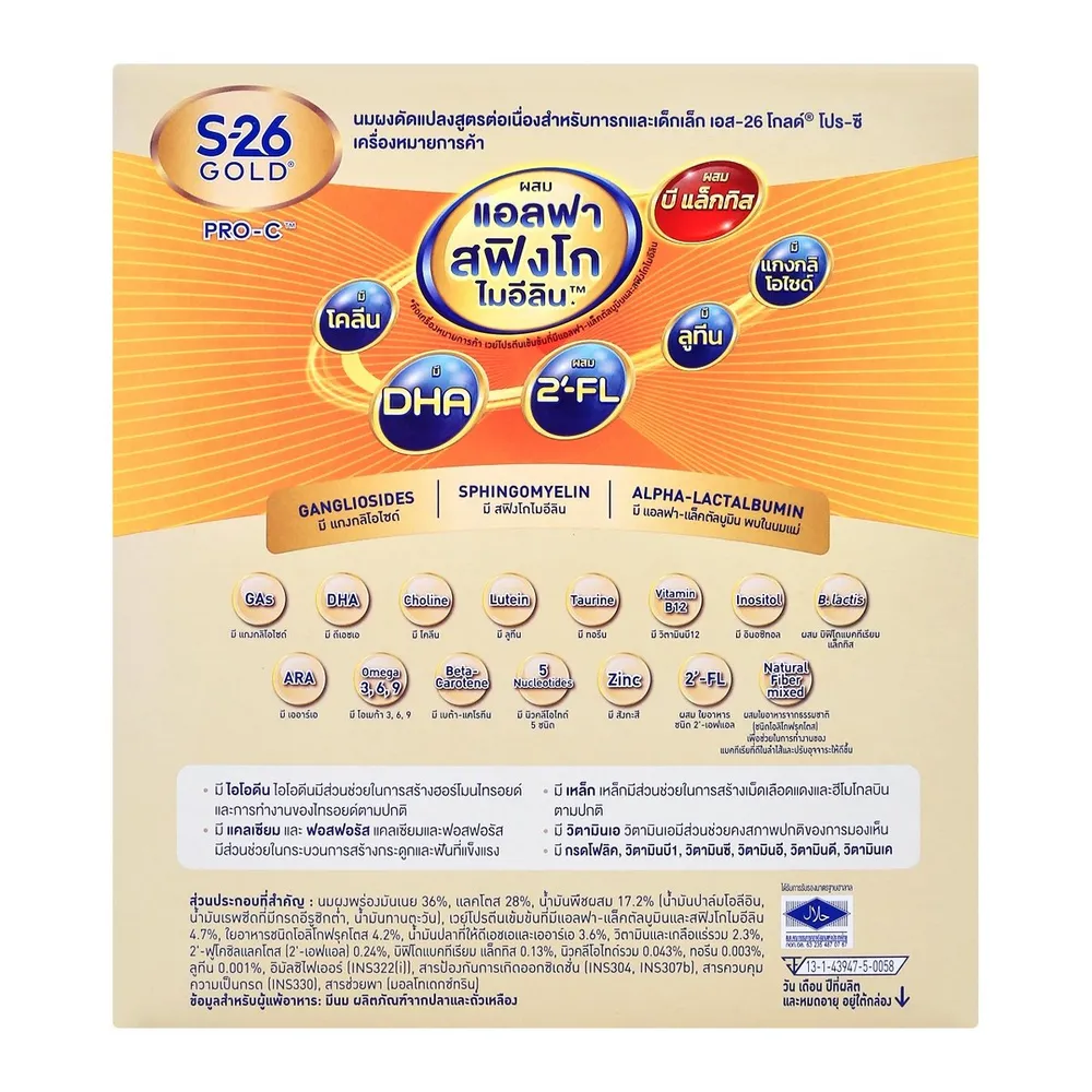 <p>เอส-26 โกลด์ โปร-ซี นมผงดัดแปลงสูตรต่อเนื่องสำหรับทารกและเด็กเล็ก สูตร 2<br /> <br /> &quot;เอส-26 โกลด์ โปร-ซี 2&quot; ผลิตภัณฑ์นมผงดัดแปลงสูตรต่อเนื่องสำหรับทารกและเด็กเล็กซึ่งอุดมไปด้วยสารอาหารที่จำเป็นและมีประโยชน์ ช่วยเตรียมความพร้อมเข้าสู่โลกแห่งการเรียนรู้ เลือกซื้อ &quot;นมผง ผ้าอ้อม ขวดนม และผลิตภัณฑ์สำหรับเด็กทารก เด็กแรกเกิด และเด็กเล็ก&quot; ได้แล้ววันนี้ผ่าน Big C Online หรือ Big C Plus ช้อปกันคุ้มสุด เสมือนยกซูเปอร์เซ็นเตอร์มาไว้ในมือถือคุณ<br /> <br /> - มี ไอโอดีน ซึ่งมีส่วนช่วยในการสร้างฮอร์โมนไทรอยด์และการทำงานของไทรอยด์ตามปกติ<br /> - มี แคลเซียม และ ฟอสฟอรัส ซึ่งมีส่วนช่วยในกระบวนการสร้างกระดูกและฟันที่แข็งแรง<br /> - มี เหล็ก ซึ่งมีส่วนช่วยในการสร้างเม็ดเลือดแดงและฮีโมโกลบินตามปกติ<br /> - มี วิตามินเอ ซึ่งมีส่วนช่วยคงสภาพปกติของการมองเห็น<br /> - มี กรดโฟลิค, วิตามินบี1, วิตามินซี, วิตามินอี, วิตามินดี, วิตามินเค<br /> - ไม่ควรเติมน้ำตาล น้ำผึ้ง หรือวัตถุให้ความหวานใด ๆ อีก เพระาอาจทำให้ทารกและเด็กเล็กฟันผุ และเป็นโรคอ้วยได้<br /> - อย่าใช้เลี้ยงทารกอายุต่ำกว่า 6 เดือน<br /> - เหมาะสำหรับเด็กที่มีอายุตั้งแต่ 6 เดือน ถึง 3 ปี<br /> - นมแม่ดีที่สุดสำหรับทารก โดยในช่วงสองปีแรกของทารกและเด็กเล็กเป็นรากฐานที่สำคัญของชีวิต องค์การอนามัยโลกแนะนำให้ทารกได้รับนมแม่อย่างต่อเนื่อง เพราะมีสารอาหารครบถ้วนและยังช่วยสร้างความผูกพันระหว่างคุณแม่กับลูก<br /> <br /> ส่วนประกอบที่สำคัญ<br /> นมผงพร่องมันเนย 36%, แลคโตส 28%, น้ำมันพืชผสม 17.2% (น้ำมันปาล์มโอลีอิน, น้ำมันเรพซีดที่มีกรดอีรูซิกต่ำ, น้ำมันทานตะวัน), เวย์โปรตีนเข้มข้นที่มีแอลฟา-แล็คตัลบูมินและสฟิงโกไมอีลิน 4.7%, ใยอาหารชนิดโอลิโกฟรุคโตส 4.2%, น้ำมันปลาที่ให้ดีเอชเอและเออาร์เอ 3.6%, วิตามินและเกลือแร่รวม 2.3%, 2&rsquo;-ฟูโคซิลแลคโตส (2&rsquo;-เอฟแอล) 0.24%, บิฟิโดแบคทีเรียม แล็กทิส 0.13%, นิวคลีโอไทด์รวม 0.043%, ทอรีน 0.003%, ลูทีน 0.001%, อิมัลซิไฟเออร์ (INS322(i)), สารป้องกันการเกิดออกซิเดชั่น (INS304, INS307b), สารควบคุมความเป็นกรด (INS330), สารช่วยพา (มอลโทเดกซ์ทริน)<br /> <br /> คำเตือน: การผสมน้ำที่ไม่ได้ต้มสุก หรือใช้ขวดนมที่ไม่ได้ผ่านการต้ม หรือผสมในอัตราส่วนที่ไม่ถูกต้อง มีผลทำให้ทารกเกิดการเจ็บป่วยได้ การเตรียมและการเก็บรักษาไม่ถูกวิธี อาจส่งผลต่อสุขภาพของบุตรท่าน<br /> ข้อมูลสำหรับผู้แพ้อาหาร: มีนม ผลิตภัณฑ์จากปลาและถั่วเหลือง<br /> <br /> <iframe allowfullscreen="allowfullscreen" frameborder="0" height="315" src="https://www.youtube.com/embed/NhOsKh9m-kE?rel=0&amp;loop=1&amp;playlist=NhOsKh9m-kE" title="น้ำนมหยดแรกสำคัญเสมอ" width="560"></iframe><br /> <br /> เลขที่ อย.<br /> 10-3-10937-5-0439<br /> <br /> <span style="color:#ff0000;">สินค้าที่ได้รับอาจมีการปรับเปลี่ย