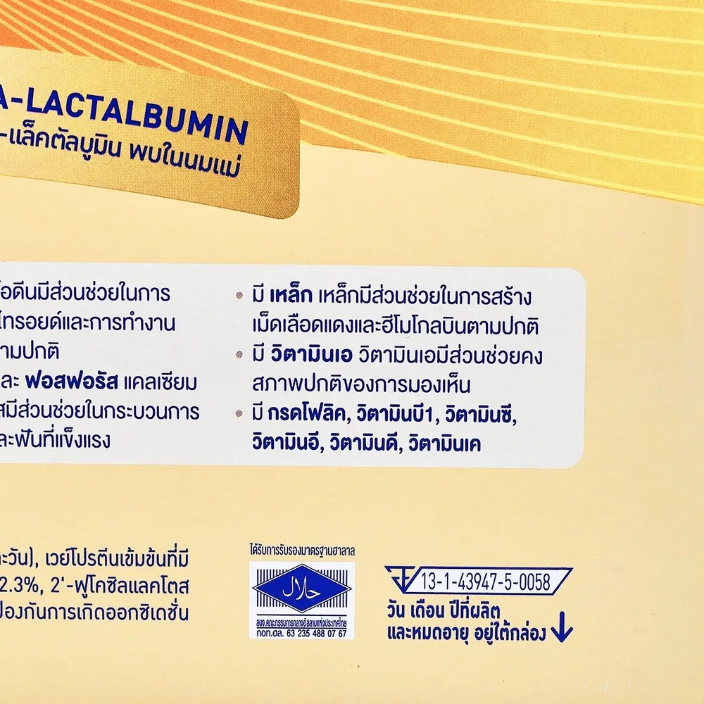 นมผงพร่องมันเนย 36%, แลคโตส 28%, น้ำมันพืชผสม 17.2% (น้ำมันปาล์มโอลีอิน, น้ำมันเรพซีดที่มีกรดอีรูซิกต่ำ, น้ำมันทานตะวัน), เวย์โปรตีนเข้มข้นที่มีแอลฟา-แล็คตัลบูมินและสฟิงโกไมอีลิน 4.7%, ใยอาหารชนิดโอลิโกฟรุคโตส 4.2%, น้ำมันปลาที่ให้ดีเอชเอและเออาร์เอ 3.6%, วิตามินและเกลือแร่รวม 2.3%, 2&rsquo;-ฟูโคซิลแลคโตส (2&rsquo;-เอฟแอล) 0.24%, บิฟิโดแบคทีเรียม แล็กทิส 0.13%, นิวคลีโอไทด์รวม 0.043%, ทอรีน 0.003%, ลูทีน 0.001%, อิมัลซิไฟเออร์ (INS322(i)), สารป้องกันการเกิดออกซิเดชั่น (INS304, INS307b), สารควบคุมความเป็นกรด (INS330), สารช่วยพา (มอลโทเดกซ์ทริน)<br />