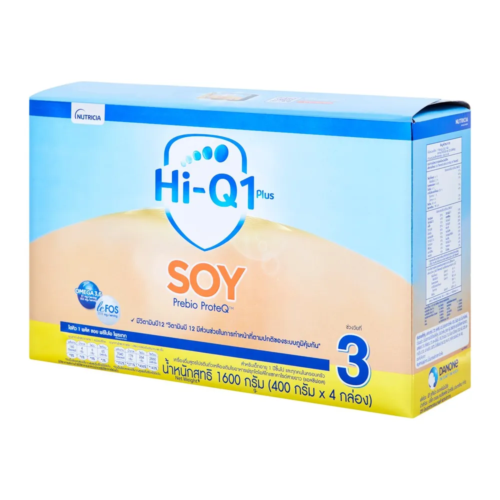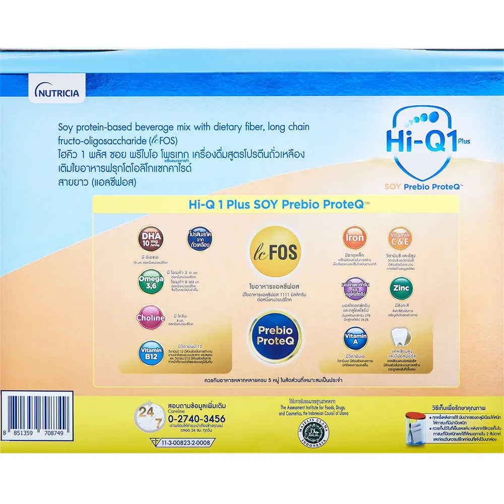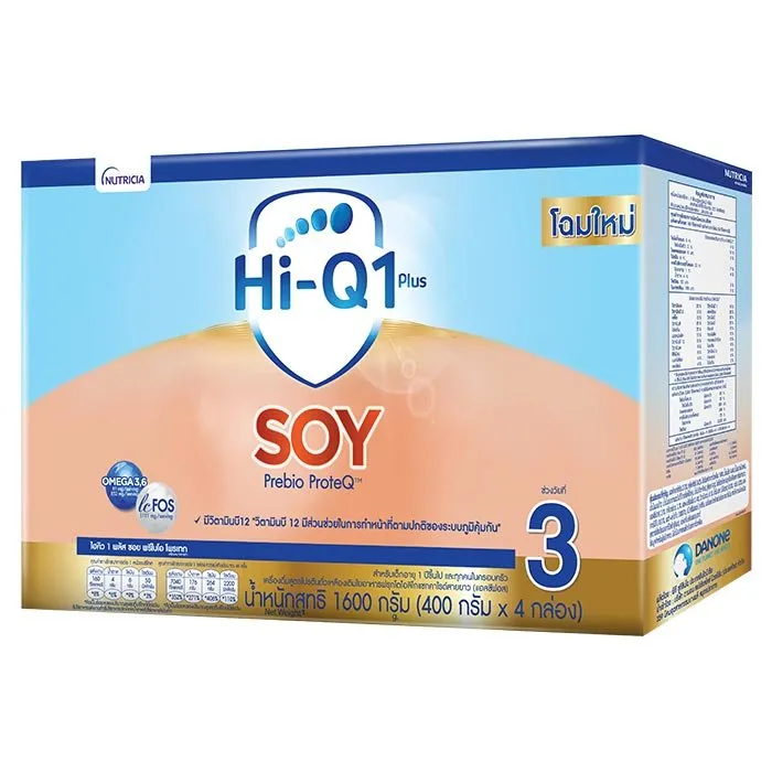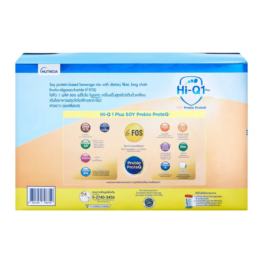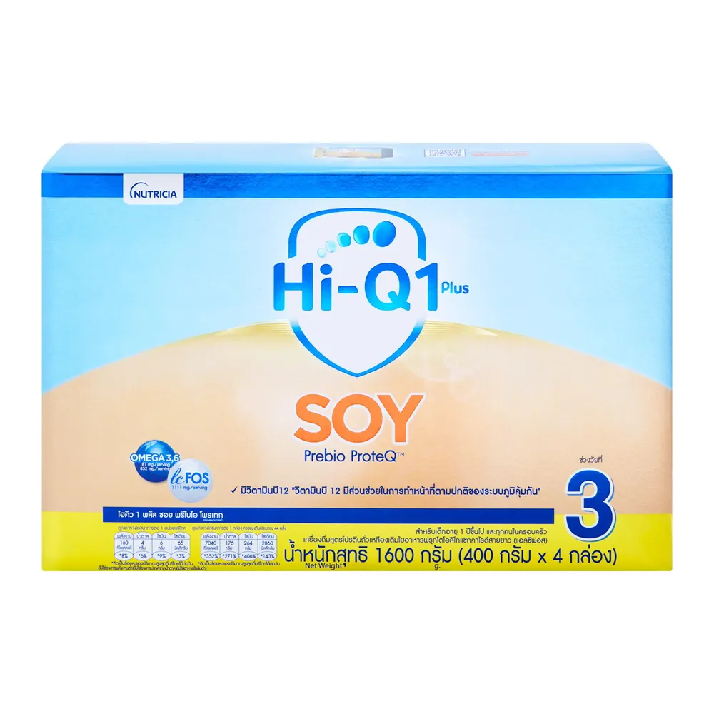 นิวทริเซีย ไฮคิว 1 พลัส ซอย พรีไบโอโพรเทก เครื่องดื่มสูตรโปรตีนถั่วเหลือง สูตรเดียวที่มีใยอาหารฟรุกโตโอลิโกแซกคาไรด์สายยาว (แอลซีฟอส) และ DHA/ARA เพื่อพัฒนาการที่ดีของลูกรัก<br />