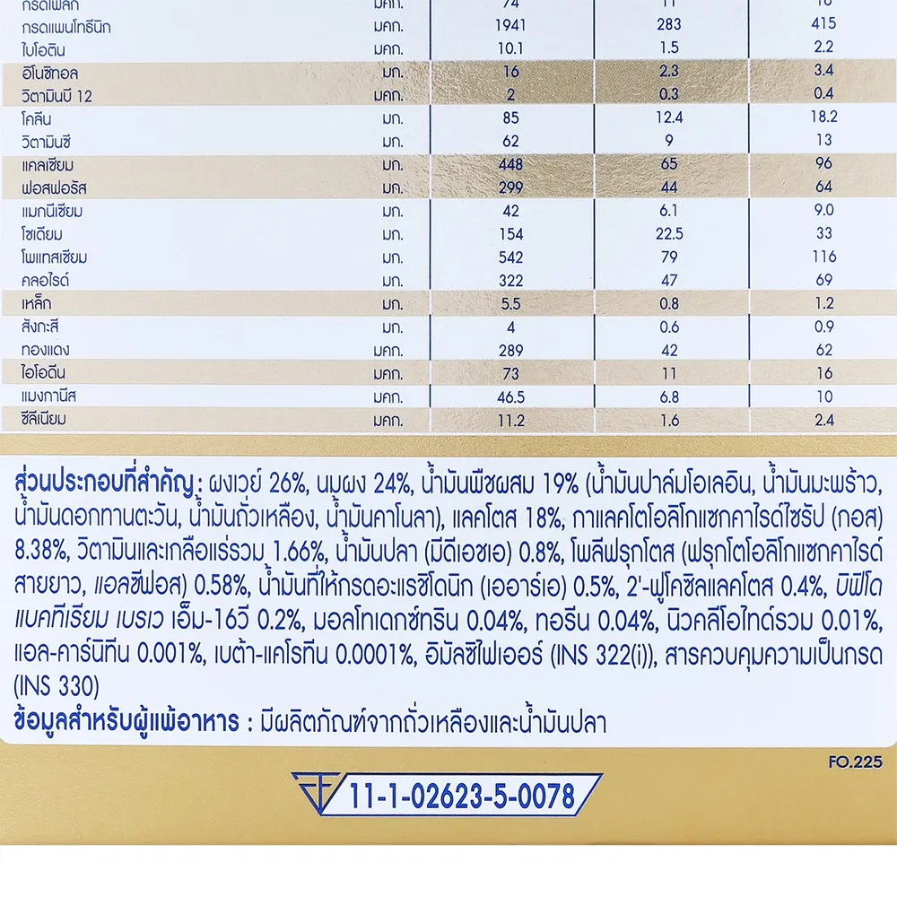 ส่วนประกอบที่สำคัญ: ผงเวย์ 26%, นมผง 24%, น้ำมันพืชผสม 19% (น้ำมันปาล์มโอเลอิน, น้ำมันมะพร้าว, น้ำมันดอกทานตะวัน, น้ำมันถั่วเหลือง, น้ำมันคาโนลา), แลคโตส 18%, กาแลคโตโอลิโกแซกคาไรด์ไซรัป (กอส) 8.38%, วิตามินและเกลือแร่รวม 1.66%, น้ำมันปลา (มีดีเอชเอ) 0.8%, โพลีฟรุกโตส (ฟรุกโตโอลิโกแซกคาไรด์ สายยาว, แอลซีฟอส) 0.58%, น้ำมันที่ให้กรดอะแรชิโดนิก (เออาร์เอ) 0.5%, 2&#39;-ฟูโคซิลแลคโตส 0.4%, บิฟิโดแบคทีเรียม เบรเว เอ็ม-16วี 0.2%, มอลโทเดกซ์ทริน 0.04%, ทอรีน 0.04%, นิวคลีโอไทด์รวม 0.01%, แอล-คาร์นิทีน 0.001%, เบต้า-แคโรทีน 0.0001%, อิมัลซิไฟเออร์ (INS 322(i)), สารควบคุมความเป็นกรด (INS 330)<br />