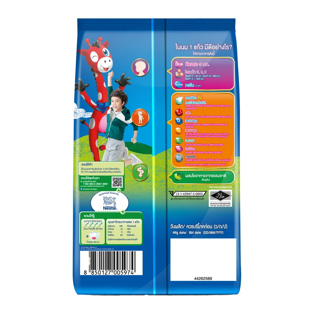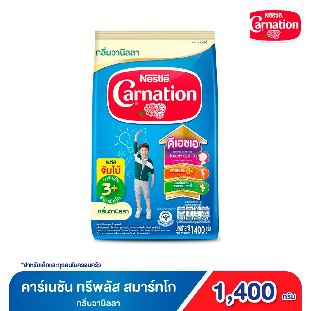 - นมผง คาร์เนชัน 3+ สมาร์ทโก เหมาะสำหรับเด็กอายุ 3 ปีขึ้นไปและทุกคนในครอบครัว<br />
