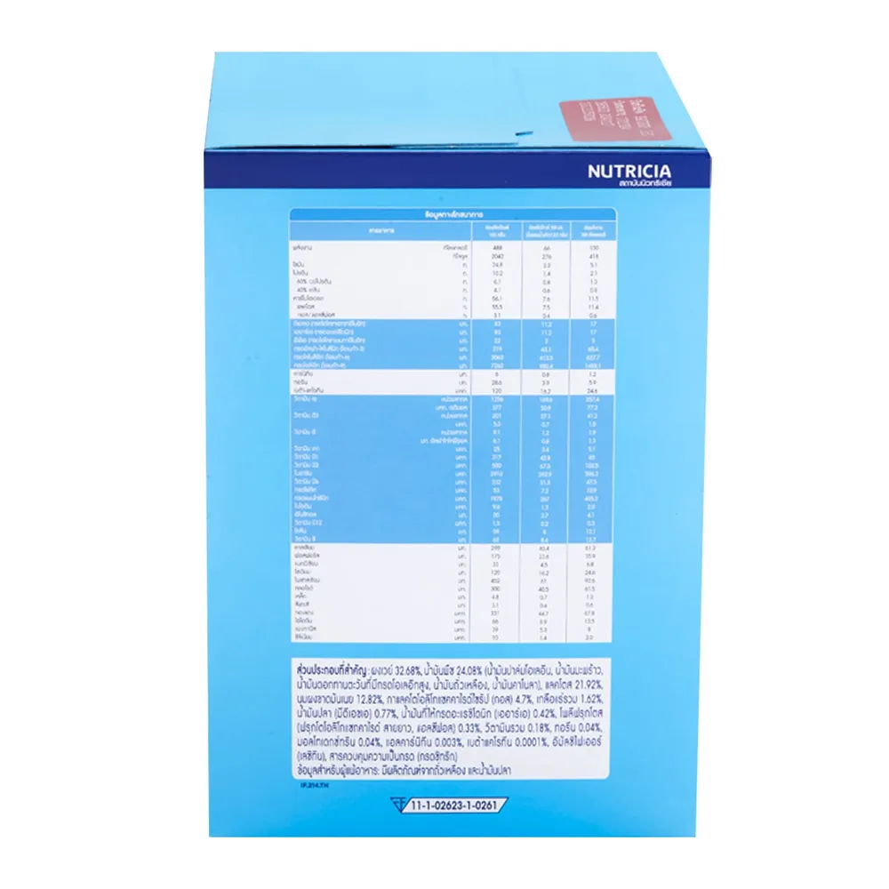 ส่วนประกอบที่สำคัญ: ผงเวย์ 32.68%, น้ำมันพืช 24.08% (น้ำมันปาล์มโอเลอิน, น้ำมันมะพร้าว, น้ำมันดอกทานตะวันที่มีกรดโอเลอิกสูง, น้ำมันถั่วเหลือง, น้ำมันคาโนลา), แลคโตส 21.92%, นมผงขาดมันเนย 12.82%, กาแลคโตโอลิโกแซคคาไรด์ไซรัป (กอส) 4.7%, เกลือแร่รวม 1.62%, น้ำมันปลา (มีดีเอชเอ) 0.77%, น้ำมันที่ให้กรดอะแรชิโดนิก (เออาร์เอ) 0.42%, โพลีฟรุกโตส (ฟรุกโตโอลิโกแซคคาไรด์ สายยาว, แอลซีฟอส) 0.33%, วิตามินรวม 0.18%, ทอรีน 0.04%, มอลโทเดกซ์ทริน 0.04%, แอลคาร์นิทีน 0.003%, เบต้าแคโรทีน 0.0001%, อิมัลซิไฟเออร์ (เลซิทิน), สารควบคุมความเป็นกรด (กรดซิทริก)<br />