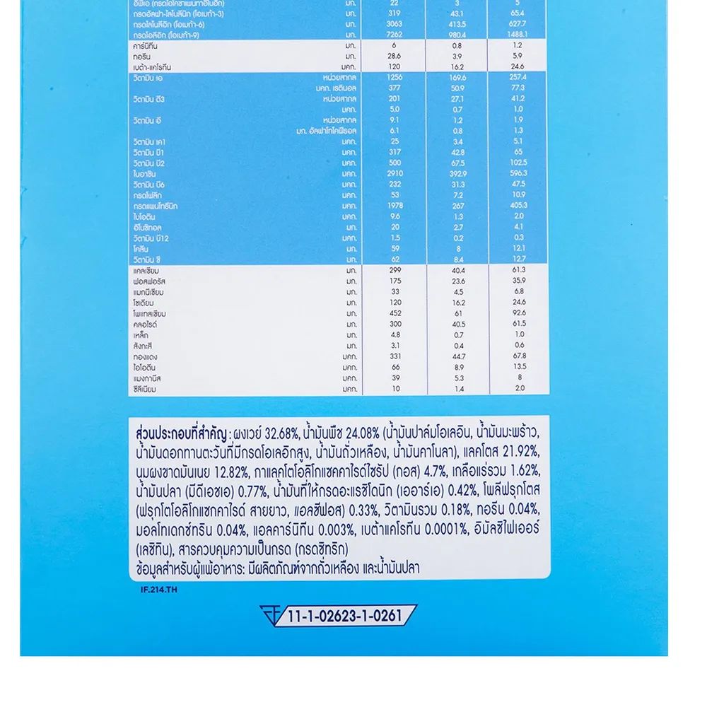ข้อมูลสำหรับผู้แพ้อาหาร: มีผลิตภัณฑ์จากถั่วเหลือง และน้ำมันปลา<br />