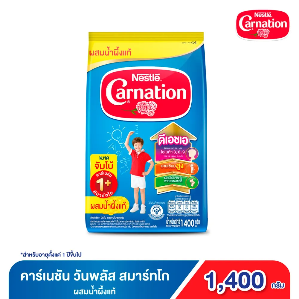 <p>คาร์เนชัน 1+ สมาร์ทโก ผลิตภัณฑ์นมผง สูตร 3 สำหรับเด็กอายุ 1 ปีขึ้นไปและทุกคนในครอบครัว<br />