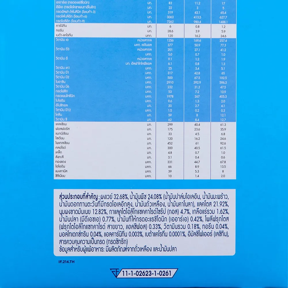 ส่วนประกอบที่สำคัญ: ผงเวย์ 32.68%, น้ำมันพืช 24.08% (น้ำมันปาล์มโอเลอิน, น้ำมันมะพร้าว, น้ำมันดอกทานตะวันที่มีกรดโอเลอิกสูง, น้ำมันถั่วเหลือง, น้ำมันคาโนลา), แลคโตส 21.92%, นมผงขาดมันเนย 12.82%, กาแลคโตโอลิโกแซคคาไรด์ไซรัป (กอส) 4.7%, เกลือแร่รวม 1.62%, น้ำมันปลา (มีดีเอชเอ) 0.77%, น้ำมันที่ให้กรดอะแรชิโดนิก (เออาร์เอ) 0.42%, โพลีฟรุกโตส (ฟรุกโตโอลิโกแซคคาไรด์ สายยาว, แอลซีฟอส) 0.33%, วิตามินรวม 0.18%, ทอรีน 0.04%, มอลโทเดกซ์ทริน 0.04%, แอลคาร์นิทีน 0.003%, เบต้าแคโรทีน 0.0001%, อิมัลซิไฟเออร์ (เลซิทิน), สารควบคุมความเป็นกรด (กรดซิทริก)<br />
