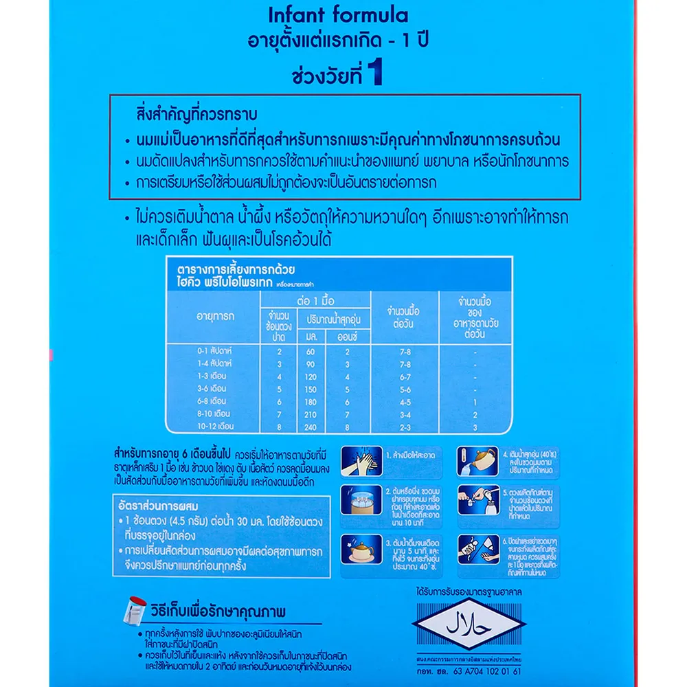 - สำหรับทารกอายุตั้งแต่ 6 เดือนขึ้นไป ทารกควรได้รับอาหารตามวัยควบคู่กับนมแม่แต่ในกรณีที่ต้องใช้นมผงชนิดนี้เลี้ยงทารกควรคำนึงถึงผลกระทบด้านค่าใช้จ่าย รวมทั้งผลเสียต่อสุขภาพ ที่อาจเกิดจากการเตรียมและการใช้อย่างไม่ถูกต้องและไม่เป็นไปตามคำแนะนำ ซึ่งอาจทำให้ทารกเจ็บป่วยได้ <br />