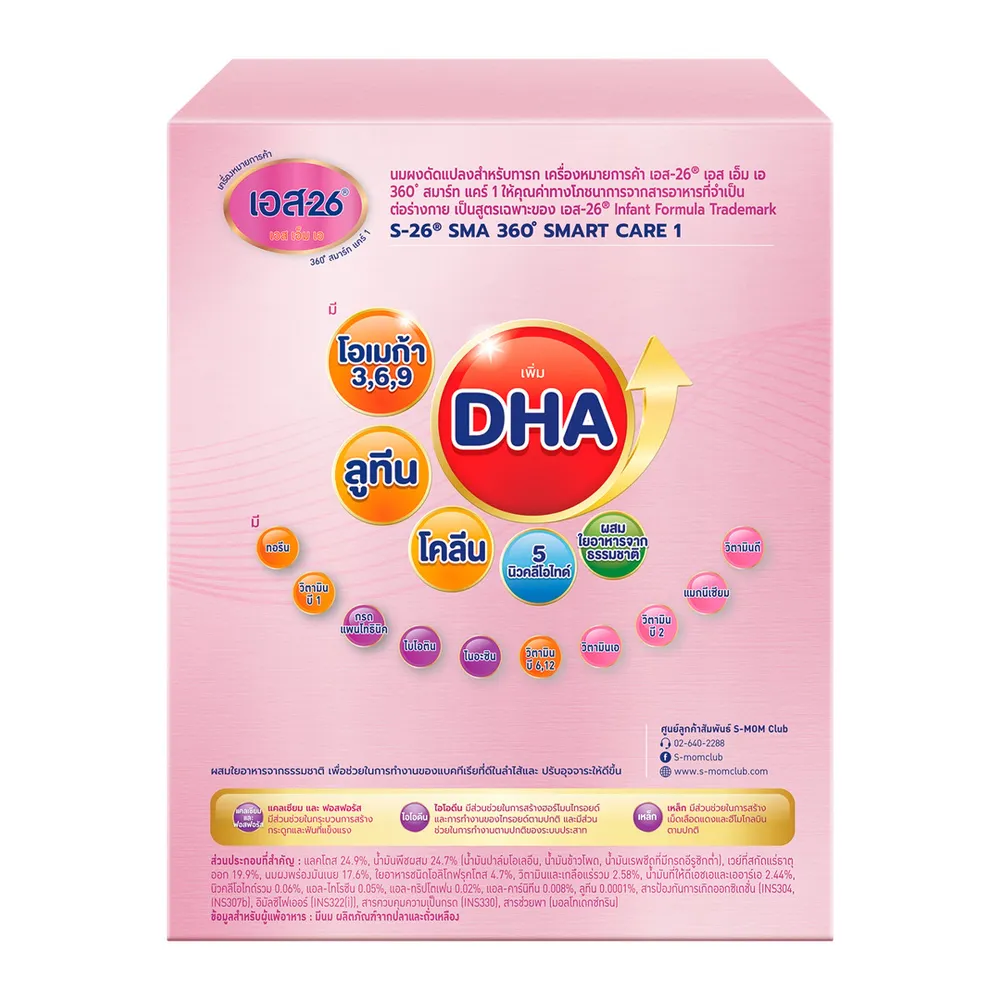 เสริมสร้างพัฒนาการให้กับลูกรักด้วย เอส-26 เอสเอ็มเอ 360 สมาร์ท แคร์ นมผงดัดแปลงสำหรับทารก สูตร 1 ผลิตภัณฑ์นมผงที่ผลิตขึ้นด้วยความพิถีพิถัน อุดมไปด้วยสารอาหารที่มีประโยชน์ ช่วยเสริมสร้างให้ลูกรักแข็งแรง พร้อมเรียนรู้ในทุกๆ ช่วงวัย และนมแม่ดีที่สุดสำหรับทารก<br />