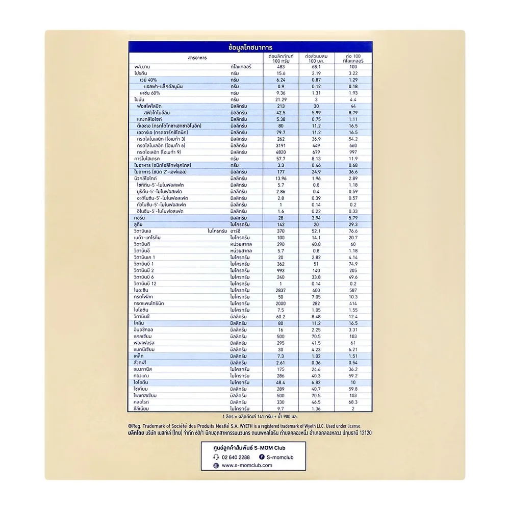 นมผงพร่องมันเนย 36%, แลคโตส 28%, น้ำมันพืชผสม 17.2% (น้ำมันปาล์มโอลีอิน, น้ำมันเรพซีดที่มีกรดอีรูซิกต่ำ, น้ำมันทานตะวัน), เวย์โปรตีนเข้มข้นที่มีแอลฟา-แล็คตัลบูมินและสฟิงโกไมอีลิน 4.7%, ใยอาหารชนิดโอลิโกฟรุคโตส 4.2%, น้ำมันปลาที่ให้ดีเอชเอและเออาร์เอ 3.6%, วิตามินและเกลือแร่รวม 2.3%, 2&rsquo;-ฟูโคซิลแลคโตส (2&rsquo;-เอฟแอล) 0.24%, นิวคลีโอไทด์รวม 0.043%, ทอรีน 0.003%, ลูทีน 0.001%, อิมัลซิไฟเออร์ (INS322(i)), สารป้องกันการเกิดออกซิเดชั่น (INS304, INS307b), สารควบคุมความเป็นกรด (INS330), สารช่วยพา (มอลโทเดกซ์ทริน) <br />