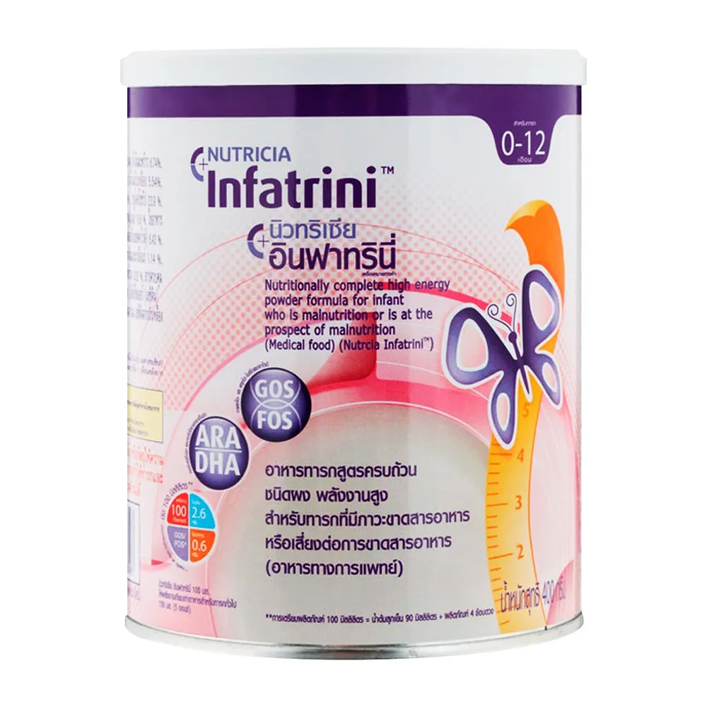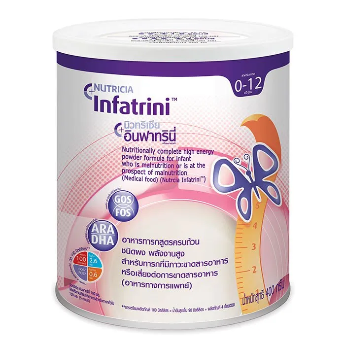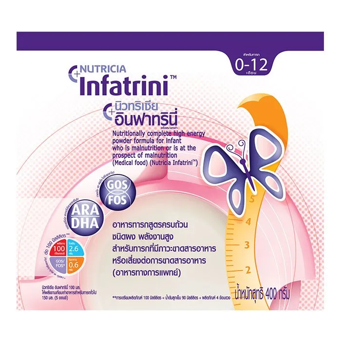 นิวทริเซีย อินฟาทรินี่ อาหารทารกสูตรครบถ้วนชนิดผง อาหารทารกสูตรครบถ้วนที่ให้พลังงานสูง เหมาะสำหรับทารกที่มีภาวะขาดสารอาหารหรือเสี่ยงต่อการขาดสารอาหาร เป็นอาหารทางการแพทย์ที่เหมาะสำหรับเด็กอายุ 0-12 เดือน<br />