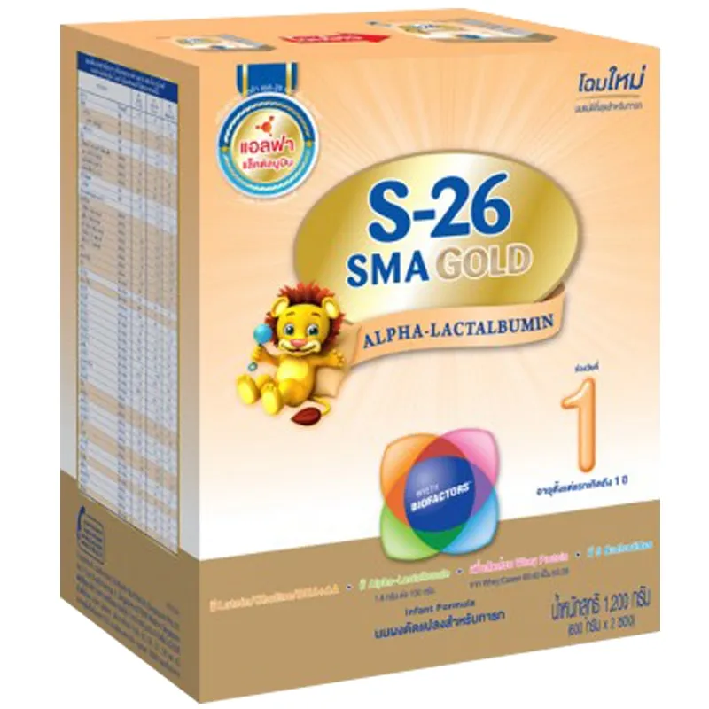 คุณแม่ทุกคนย่อมอยากมอบสิ่งที่ดีที่สุดให้กับลูกน้อย เพื่อให้เขามีพัฒนาการที่ดีในทุกๆ ด้าน ทุกอย่างเริ่มต้นจากพื้นฐานที่ดี และหนึ่งในพื้นฐานนั้นเริ่มต้นได้จากโภชนาการที่เหมาะสม ด้วยนมผง S-26 SMA Gold Alpha-Lactalbumin สูตรพัฒนาไปอีกขั้นที่มี แอลฟา-แล็คตัลบูมิน สารอาหารที่ช่วยเสริมสร้างการทำงานของสมอง เพื่อให้ลูกน้อยเติบโต ฉลาด แข็งแรง<br /><br />รายละเอียดสินค้า<br />- ขนาด 1,200 กรัม<br />- สำหรับเด็กแรกเกิดถึง 1 ปี<br />- มีแอลฟา-แล็คตัลบูมิน สารอาหารที่ช่วยเสริมการทำงานของสมอง <br />- มีสารอาหาร DHA+AA 5 นิวคลีโอไทด์ ลูทีน ใยอาหารจากธรรมชาติ <br />- วิตามินบี 12 สูง มีส่วนช่วยในการทำงานของระบบประสาทและสมอง <br />- มีวิตามินบี 1 มีส่วนช่วยในการทำงานของระบบประสาทและกล้ามเนื้อ <br />- มีไอโอดีนสูง เป็นส่วนประกอบที่สำคัญของฮอร์โมนไทรอยด์ ซึ่งมีหน้าที่ควบคุมการเจริญเติบโต และการพัฒนาของร่างกายและสมอง <br />- มีแคลเซียม และฟอสฟอรัสสูง มีส่วนช่วยในกระบวนการสร้างกระดูกและฟันที่แข็งแรง <br />- วิตามินดีสูง ช่วยดูดซึมแคลเซียมและฟอสฟอรัส <br />- มีธาตุเหล็กสูง ซึ่งเป็นส่วนประกอบสำคัญของฮีโมโกลบินในเม็ดเลือดแดง <br />- โฟเลตสูง มีส่วนสำคัญในการสร้างเม็ดเลือดแดง <br /><br />3.2 คำเตือน / คำแนะนำ<br />- นมแม่เป็นอาหารที่ดีที่สุดสำหรับทารกเพราะมีคุณค่าทางโภชนาการครบถ้วน<br />- นมผงสำหรับทารกควรใช้ตามคำแนะนำของแพทย์ พยาบาล หรือนักโภชนาการ<br />- การเตรียมหรือใช้ส่วนผสมไม่ถูกต้องจะเป็นอันตรายต่อทารก<br /><br />วิธีใช้ / การเก็บรักษา<br />- ถุงอลูมิเนียมที่ยังไม่ได้เปิดใช้ให้เก็บไว้ในที่แห้งและเย็น<br />- ถุงที่เปิดใช้แล้ว ต้องพับปากถุงให้ปิดสนิทหลังจากการใช้งานทุกครั้ง เพื่อให้นมผงมีความใหม่เสมอ<br />- ควรเก็บไว้ในที่แห้ง เย็น ปราศจากความชื้น<br />- ควรใช้ให้หมด ภายใน 4 สัปดาห์ หลังจากเปิดถุงแล้ว หลีกเลี่ยงการเก็บในที่อุณหภูมิร้อนจัด หรือเย็นจัดเป็นระยะเวลานาน