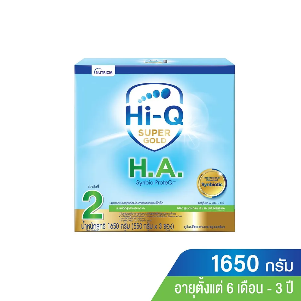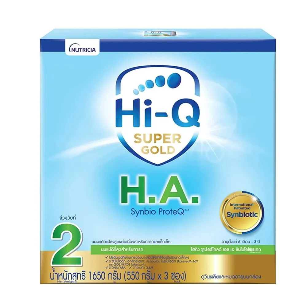 ไฮคิว ซุปเปอร์โกลด์ เอช เอ ซินไบโอโพรเทค นมผงดัดแปลงสูตรต่อเนื่องสำหรับเด็กทารกและเด็กเล็ก นมผงคุณภาพดีเยี่ยม ที่ถูกพัฒนาสูตรโดยผู้เชี่ยวชาญด้านโภชนาการของสถาบันนิวทริเซีย ให้เหมาะสมกับทารกและเด็กเล็ก เพื่อให้มีคุณค่าทางสารอาหารและโภชนาการที่เหมาะสมในการเสริมสร้างการเจริญเติบโตของเด็กเล็ก<br />