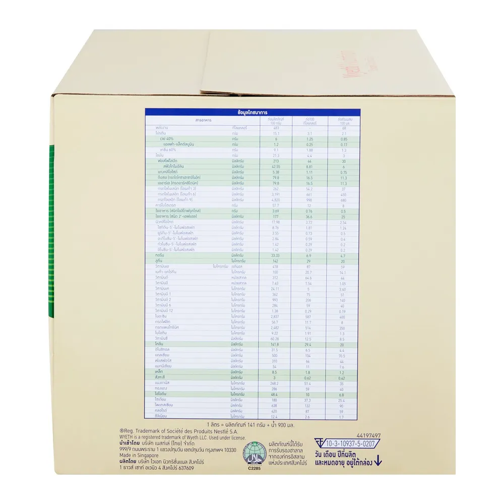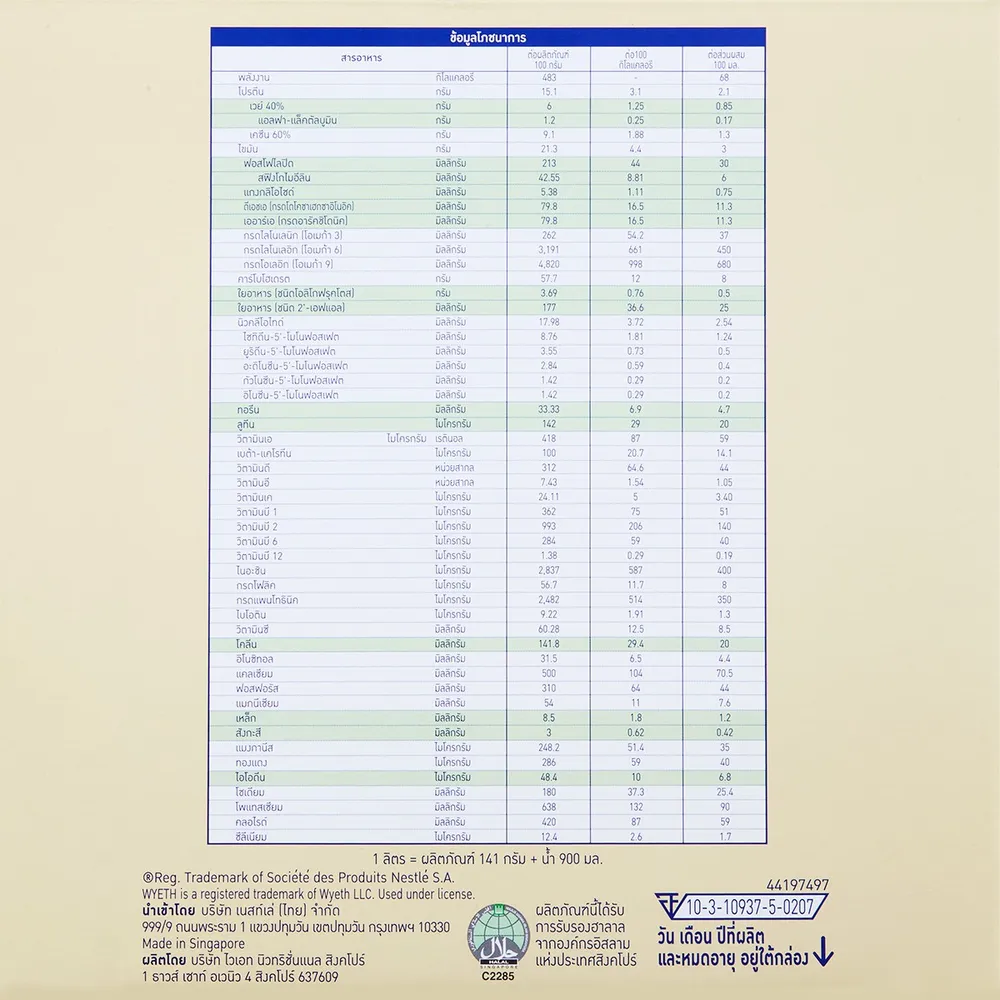 นมผงพร่องมันเนย 36%, แลคโตส 28%, น้ำมันพืชผสม 17.2% (น้ำมันปาล์มโอลีอิน, น้ำมันเรพซีดที่มีกรดอีรูซิกต่ำ, น้ำมันทานตะวัน), เวย์โปรตีนเข้มข้นที่มีแอลฟา-แล็คตัลบูมินและสฟิงโกไมอีลิน 4.7%, ใยอาหารชนิดโอลิโกฟรุคโตส 4.2%, น้ำมันปลาที่ให้ดีเอชเอและเออาร์เอ 3.6%, วิตามินและเกลือแร่รวม 2.3%, 2&rsquo;-ฟูโคซิลแลคโตส (2&rsquo;-เอฟแอล) 0.24%, นิวคลีโอไทด์รวม 0.043%, ทอรีน 0.003%, ลูทีน 0.001%, อิมัลซิไฟเออร์ (INS322(i)), สารป้องกันการเกิดออกซิเดชั่น (INS304, INS307b), สารควบคุมความเป็นกรด (INS330), สารช่วยพา (มอลโทเดกซ์ทริน)<br />