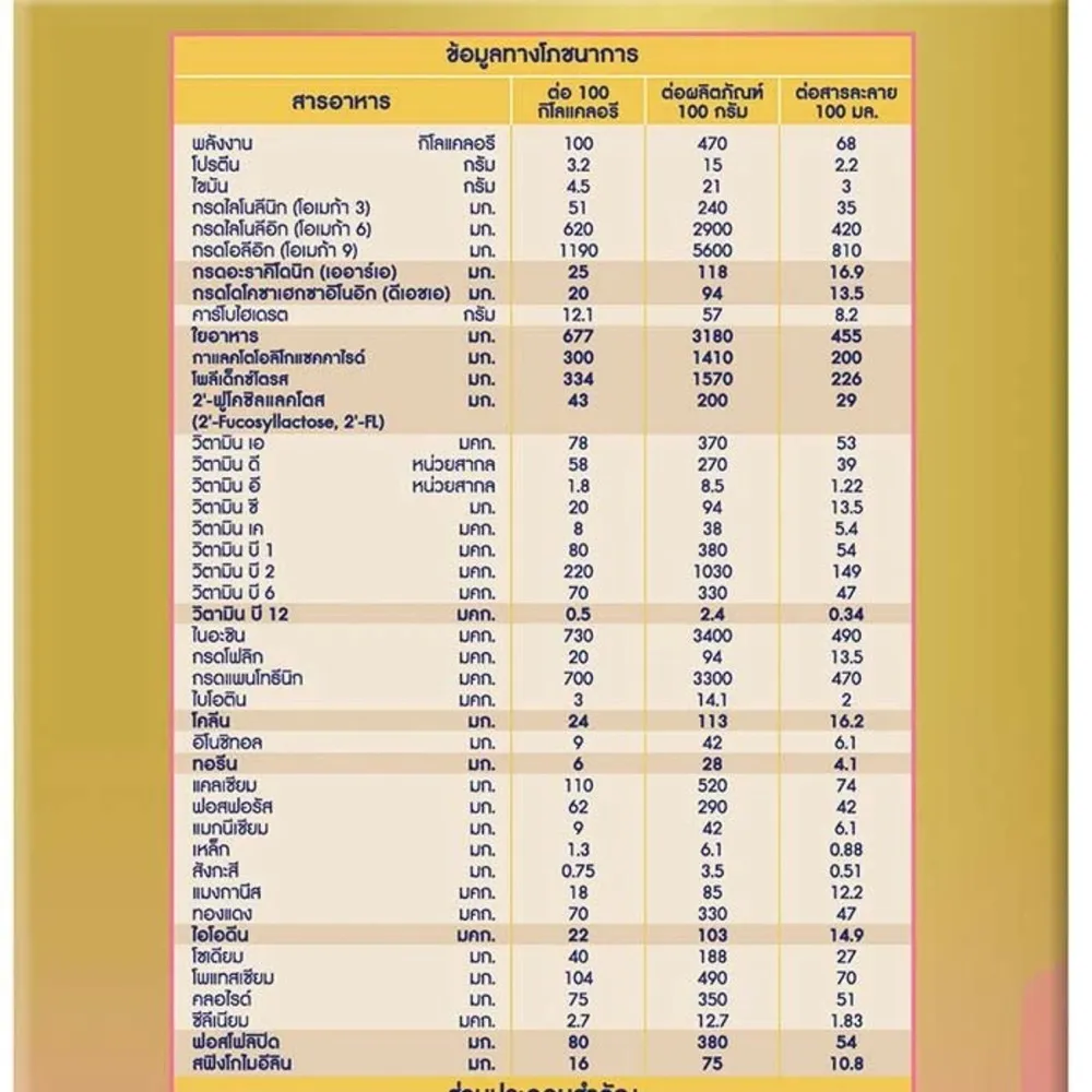 - มี 2&#39;-ฟูโคซิลแลคโตส (2&#39;-FL) เป็นโอลิโกแซคคาไรด์และใยอาหาร<br />