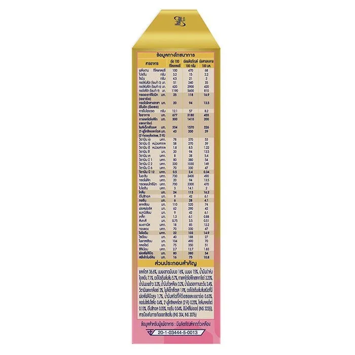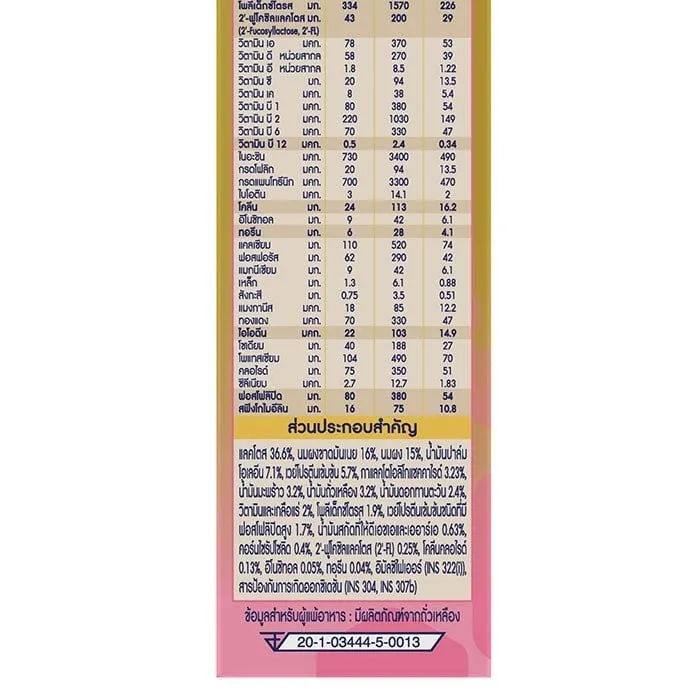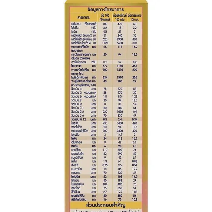 - พร้อมด้วยคุณค่าทางโภชนาการโดยมีปริมาณสารอาหาร โปรตีน คาร์โบไฮเดรต ไขมัน วิตามิน และแร่ธาตุในปริมาณที่เหมาะสมต่อการเจริญเติบโต และพัฒนาการทางร่างกายของทารก<br />