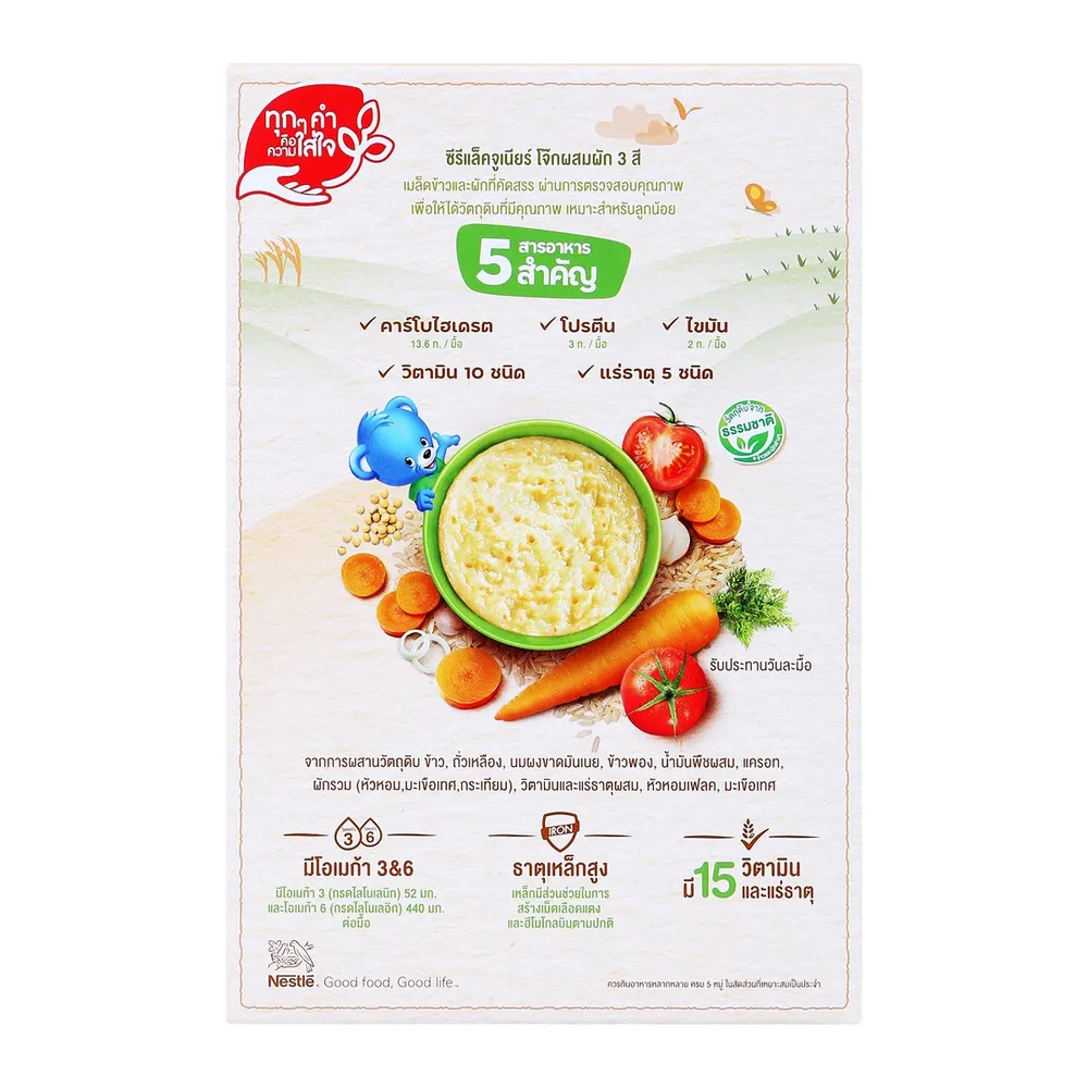- อาหารเสริมธัญพืช สูตรโจ๊กผัก 3 สี สำหรับเด็กเล็กอายุเกิน 12 เดือน ถึง 3 ปี ตราเนสท์เล่ ซีรีแล็ค จูเนียร์<br />