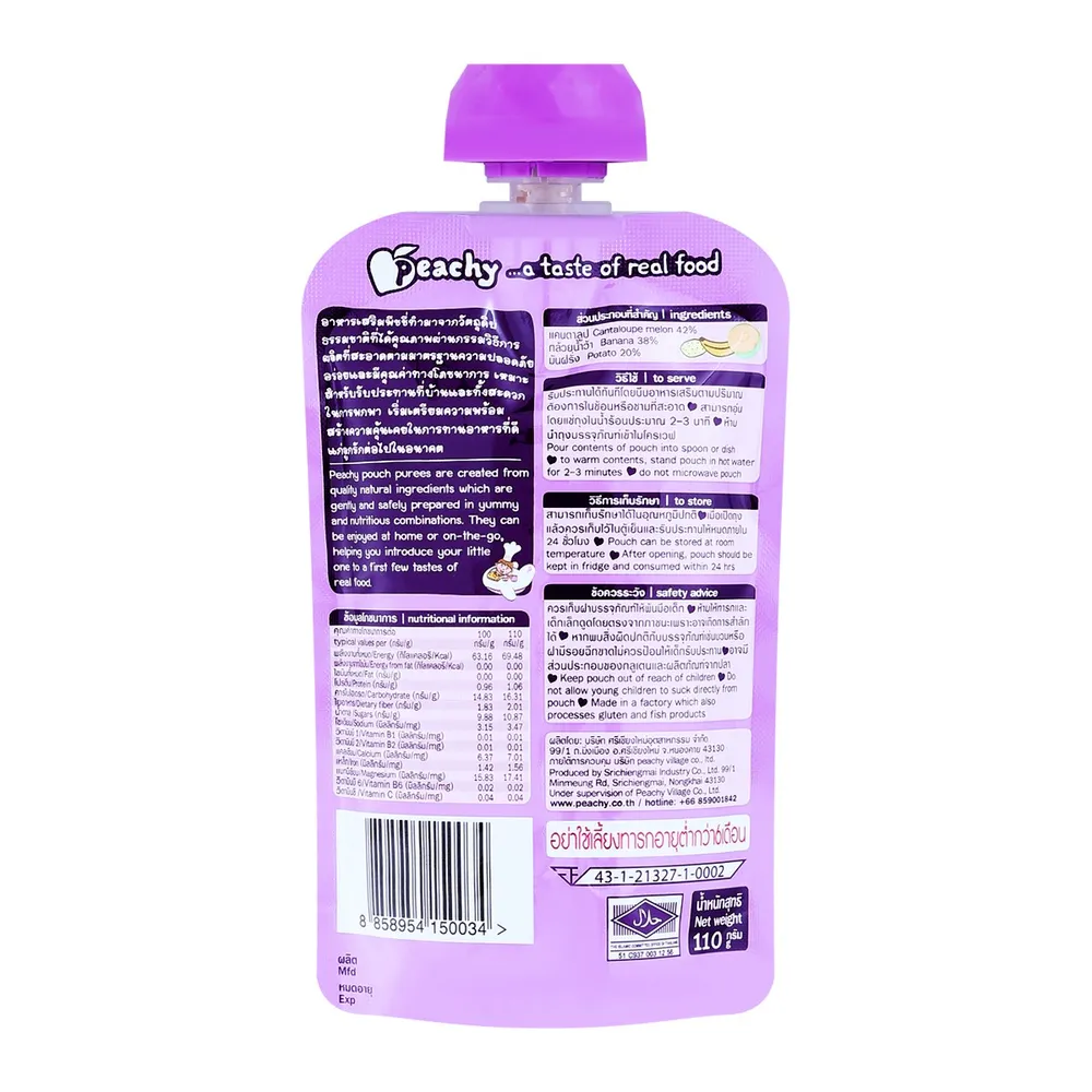 <p>พีชชี่ กล้วยน้ำว้าผสมแคนตาลูปและมันฝรั่งบด 110 กรัม</p>