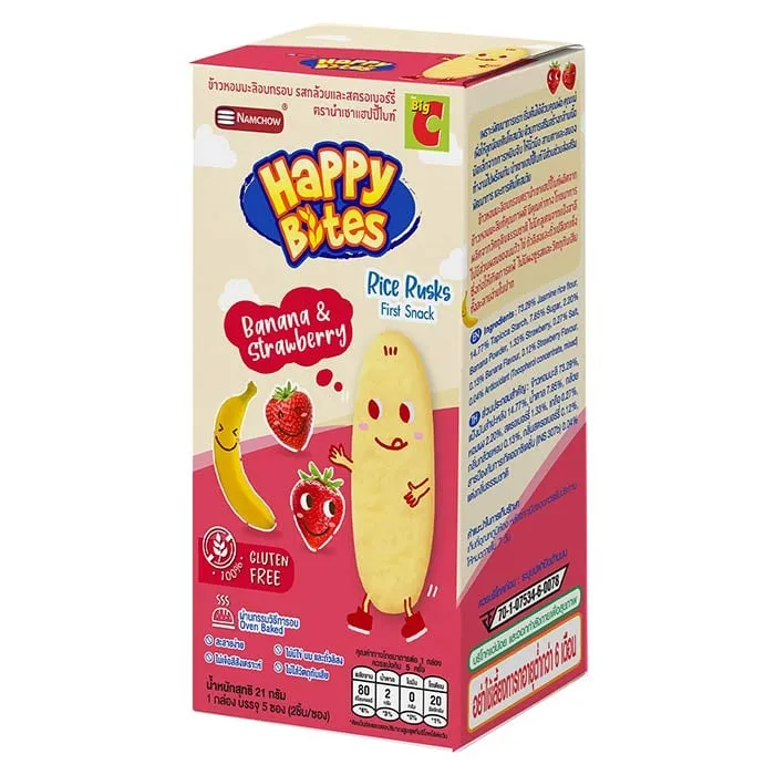นำเชาแฮปปี้ไบท์ ข้าวหอมมะลิอบกรอบ รสกล้วยและสตรอว์เบอร์รี่ สำหรับเด็กอายุ 6 เดือนขึ้นไป 21 ก.