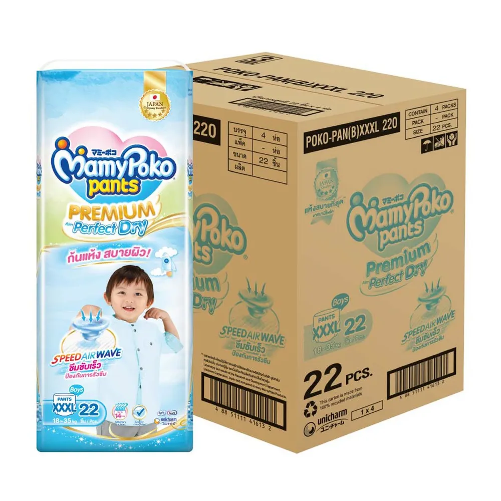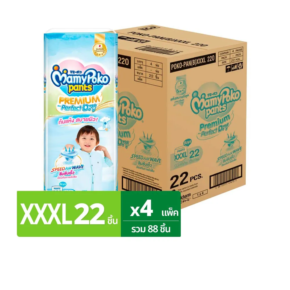 มามี่โพโค แพนท์ กางเกงผ้าอ้อม พรีเมียม เอม เพอร์เฟกต์ ดราย เด็กชาย ขนาด XXXL 22 ชิ้น x 4 แพ็ค