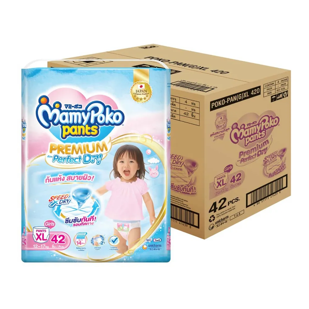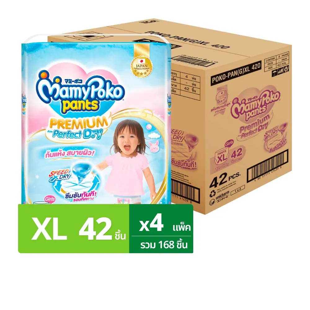 มามี่โพโค แพนท์ กางเกงผ้าอ้อม พรีเมียม เอม เพอร์เฟกต์ ดราย สำหรับเด็กหญิง ขนาด XL 42 ชิ้น x 4 แพ็ค