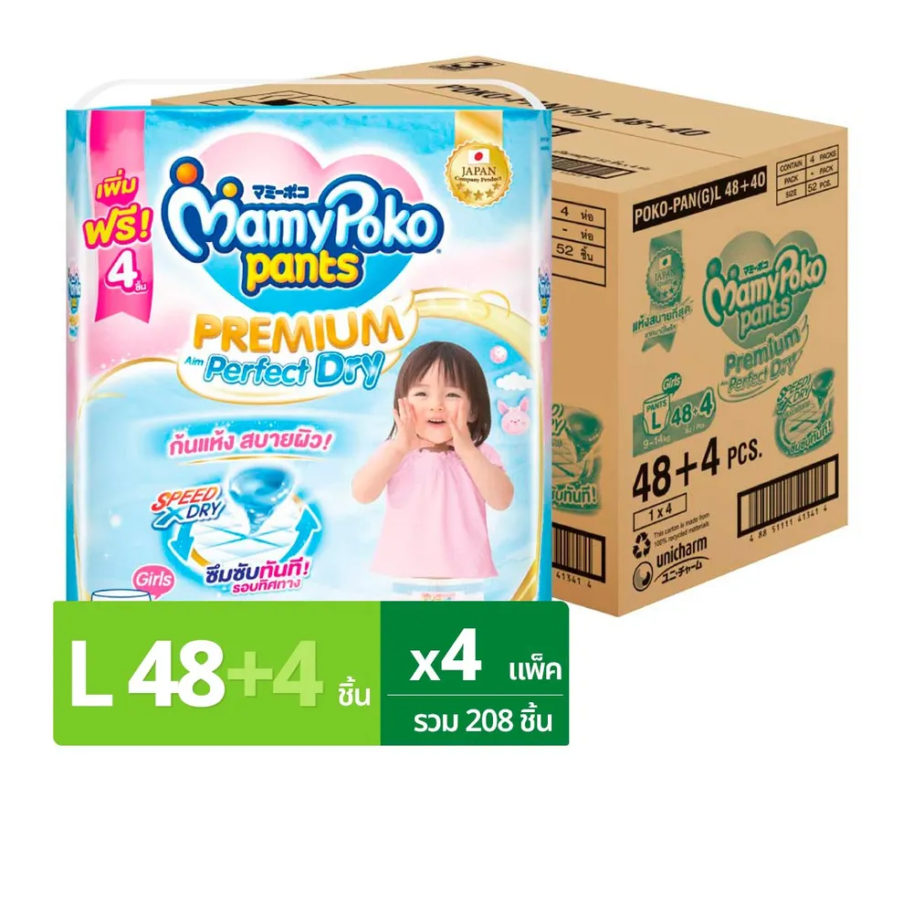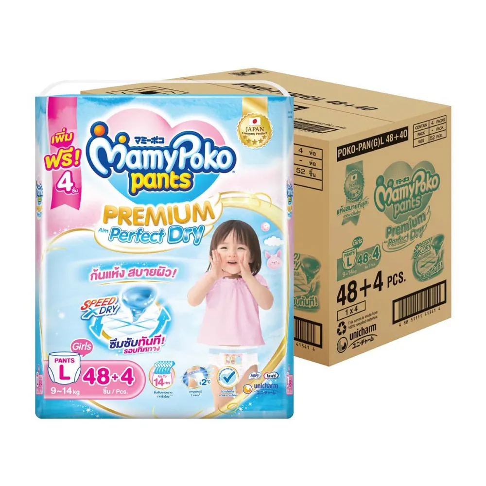 มามี่โพโค แพนท์ กางเกงผ้าอ้อม พรีเมียม เอม เพอร์เฟกต์ ดราย สำหรับเด็กหญิง ขนาด L 48 ชิ้น x 4 แพ็ค