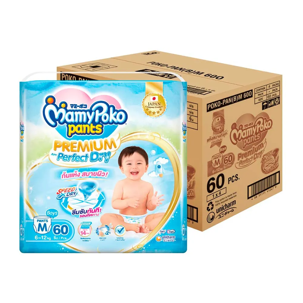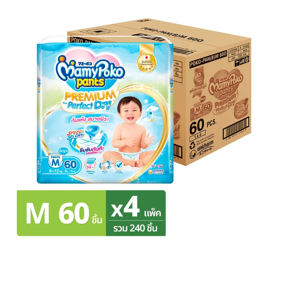 มามี่โพโค แพนท์ กางเกงผ้าอ้อม พรีเมียม เอม เพอร์เฟกต์ ดราย สำหรับเด็กชาย ขนาด M 60 ชิ้น x 4 แพ็ค