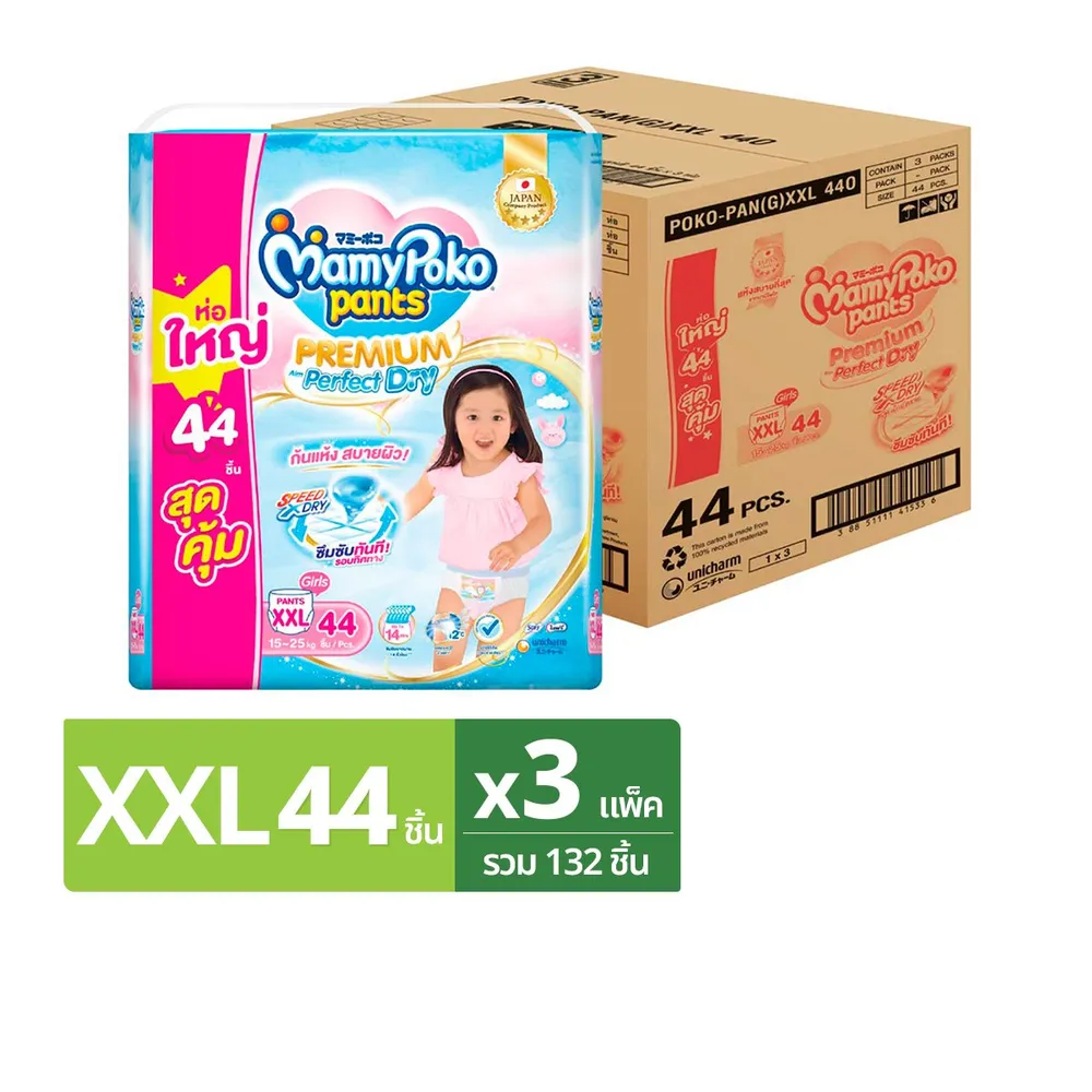 มามี่โพโค แพนท์ กางเกงผ้าอ้อม พรีเมียม เอม เพอร์เฟกต์ ดราย สำหรับเด็กผู้หญิง ขนาด XXL 44 ชิ้น x 3 แพ็ค