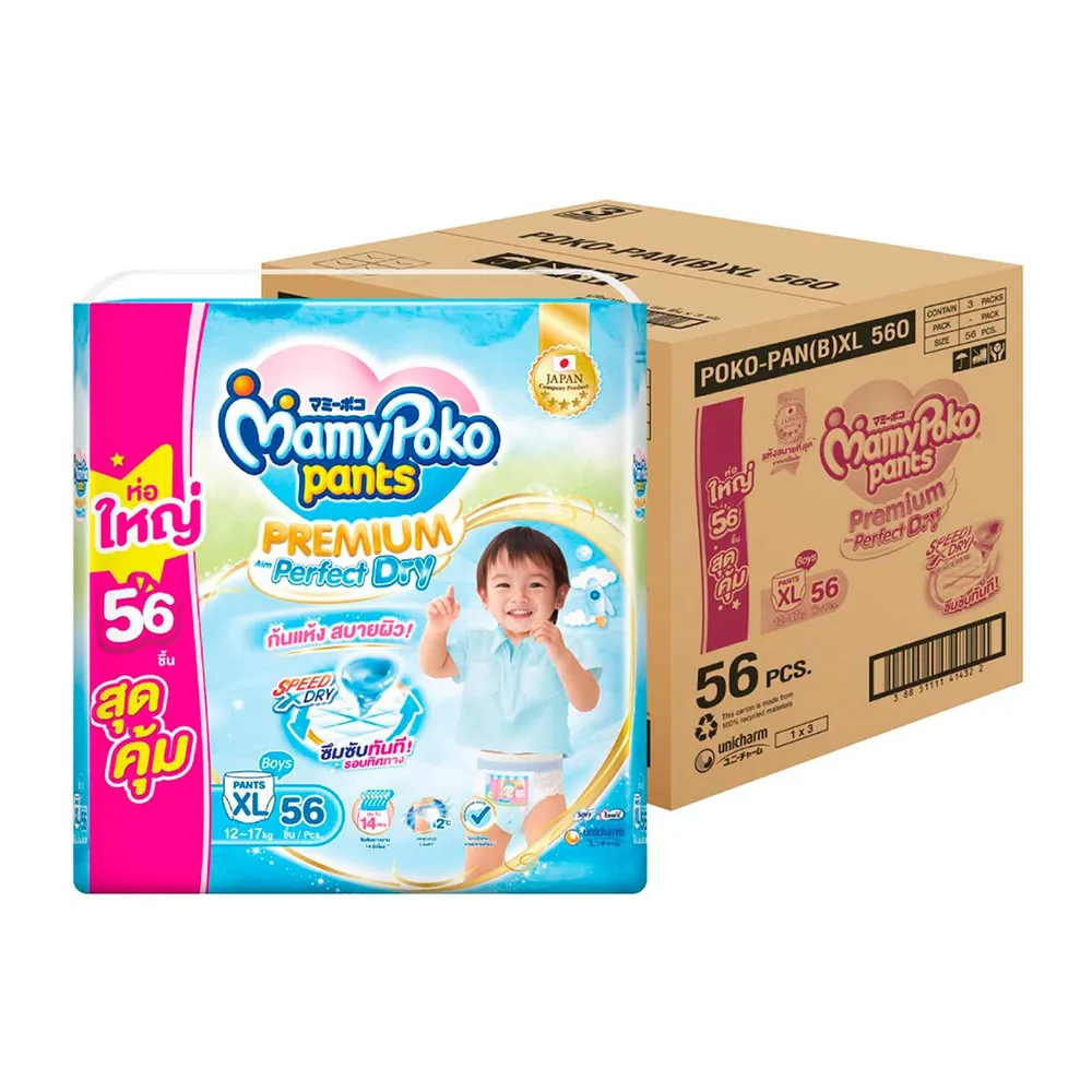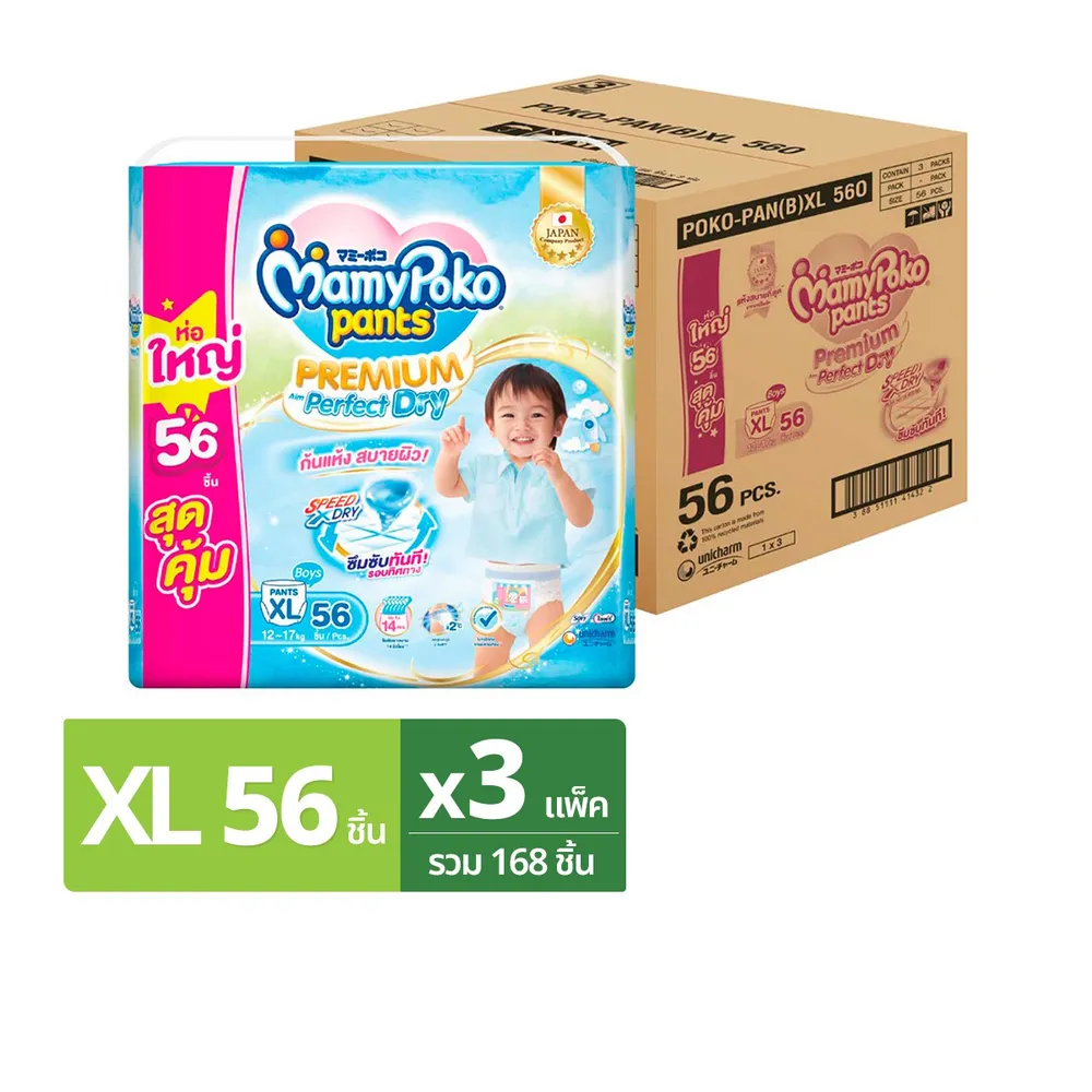 มามี่โพโค แพนท์ กางเกงผ้าอ้อม พรีเมียม เอม เพอร์เฟกต์ ดราย สำหรับเด็กผู้ชาย ขนาด XL 56 ชิ้น x 3 แพ็ค