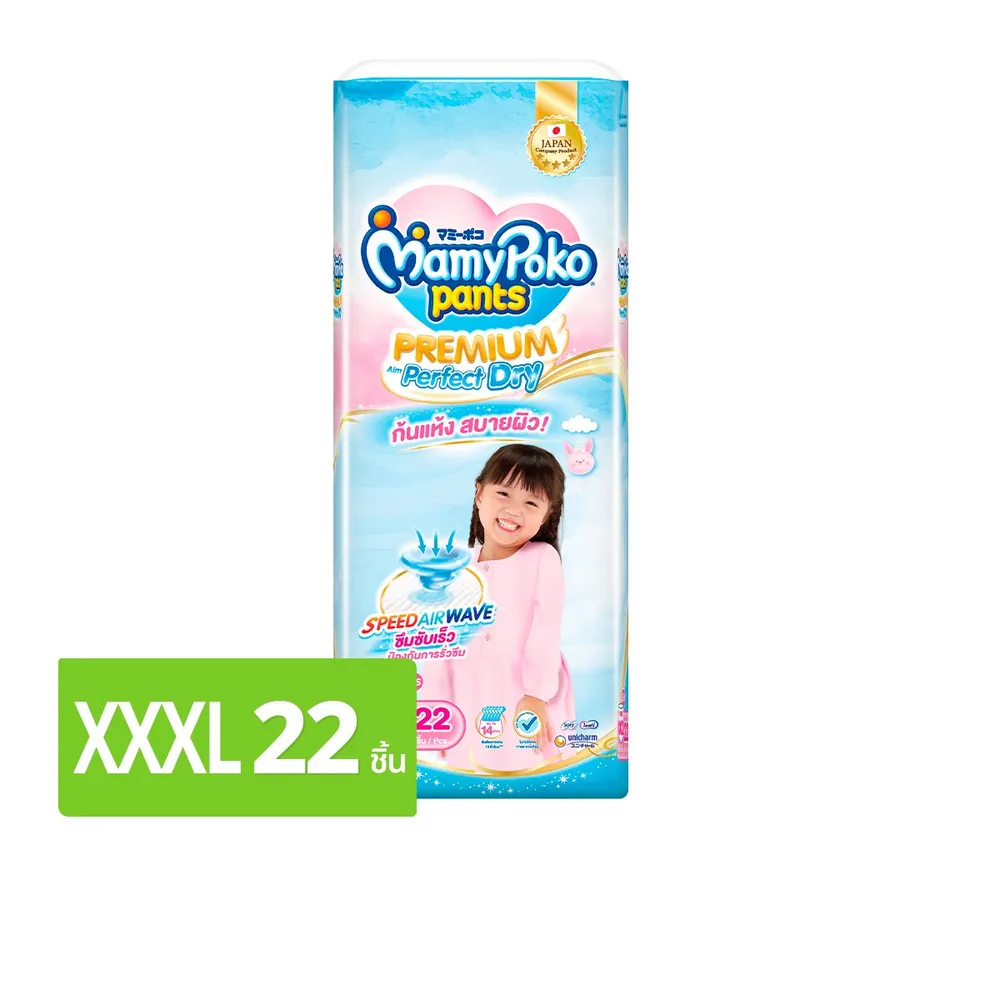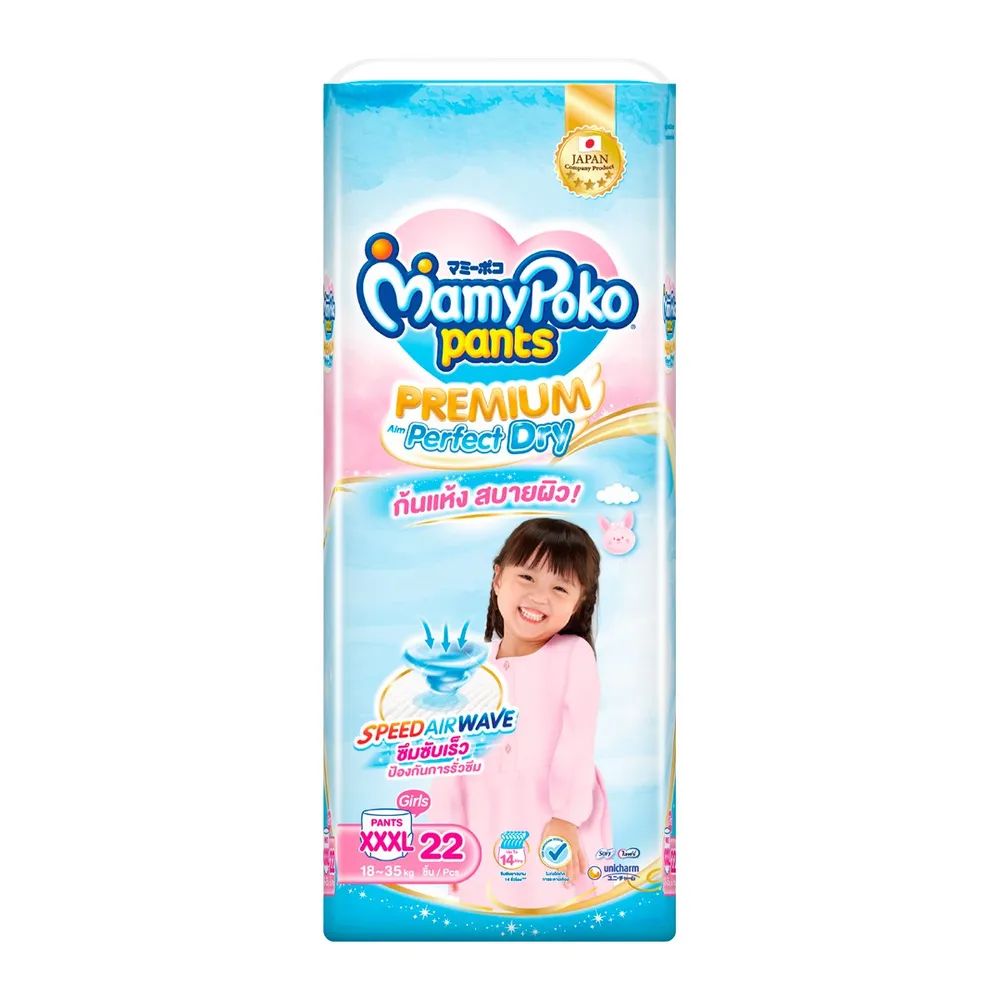 มามี่โพโค แพนท์ กางเกงผ้าอ้อม พรีเมียม เอม เพอร์เฟกต์ ดราย สำหรับเด็กหญิง ขนาด XXXL 22 ชิ้น