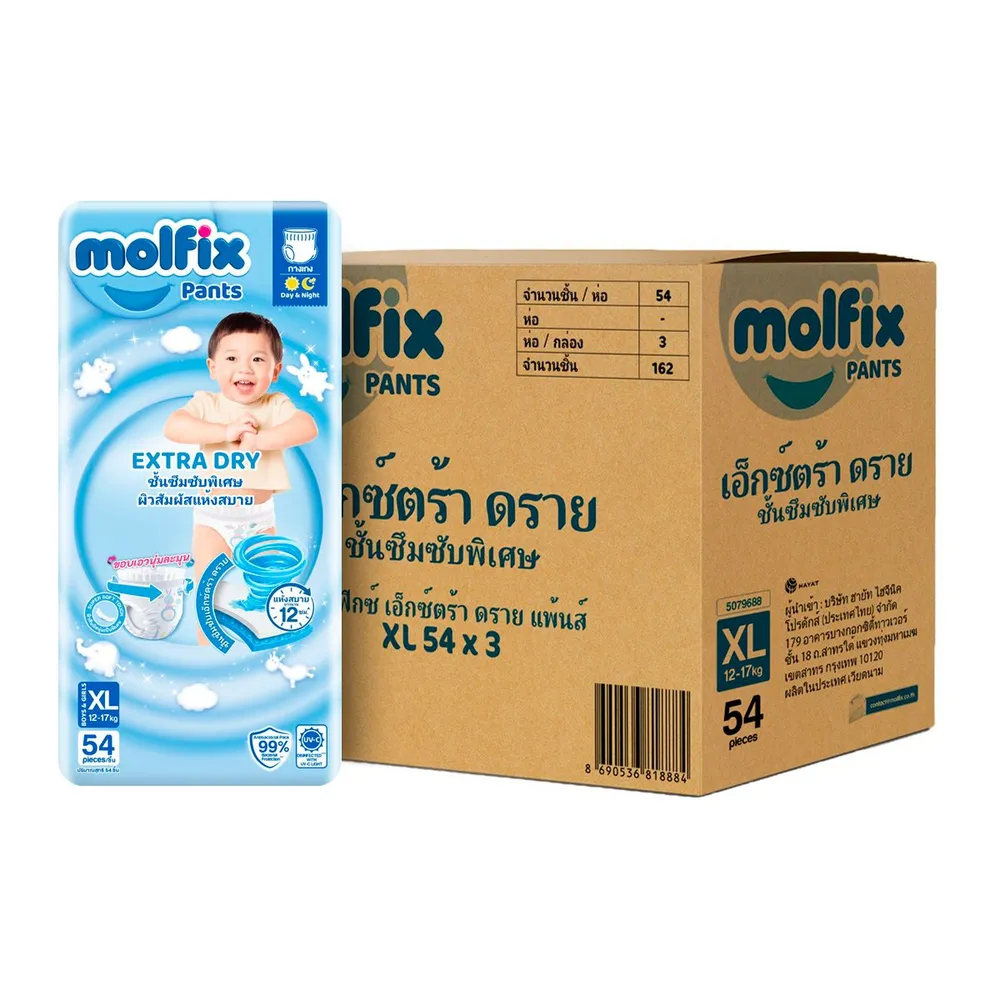 โมลฟิกซ์ เอ็กซ์ตร้าดราย แพ้นส์ กางเกงผ้าอ้อมเด็ก ขนาด XL 54 ชิ้น x 3 แพ็ค