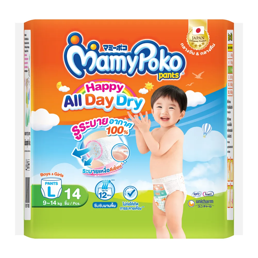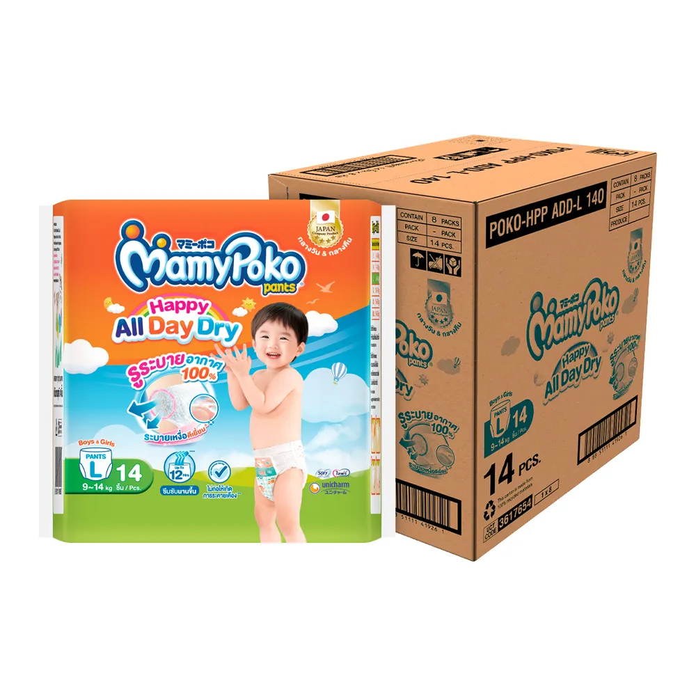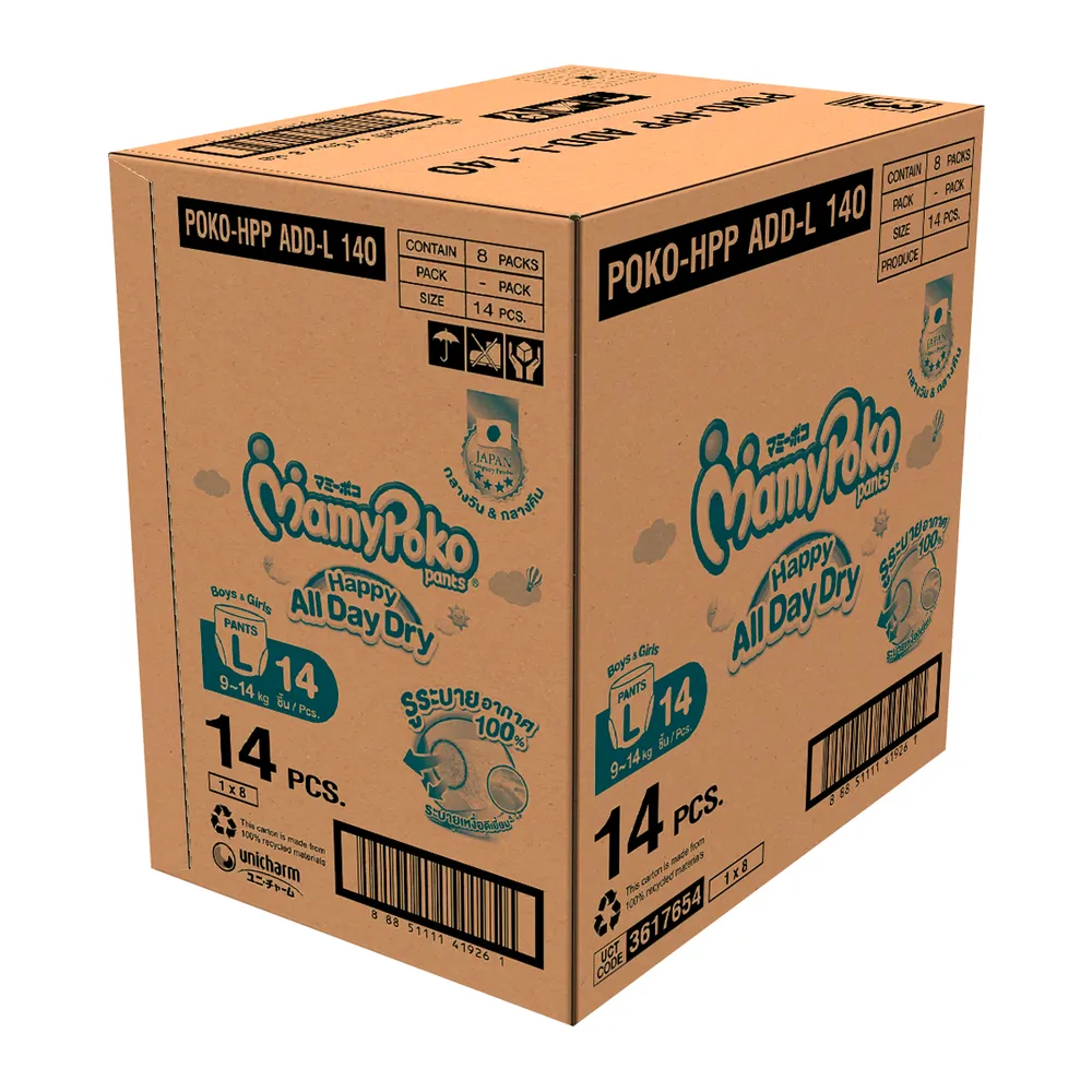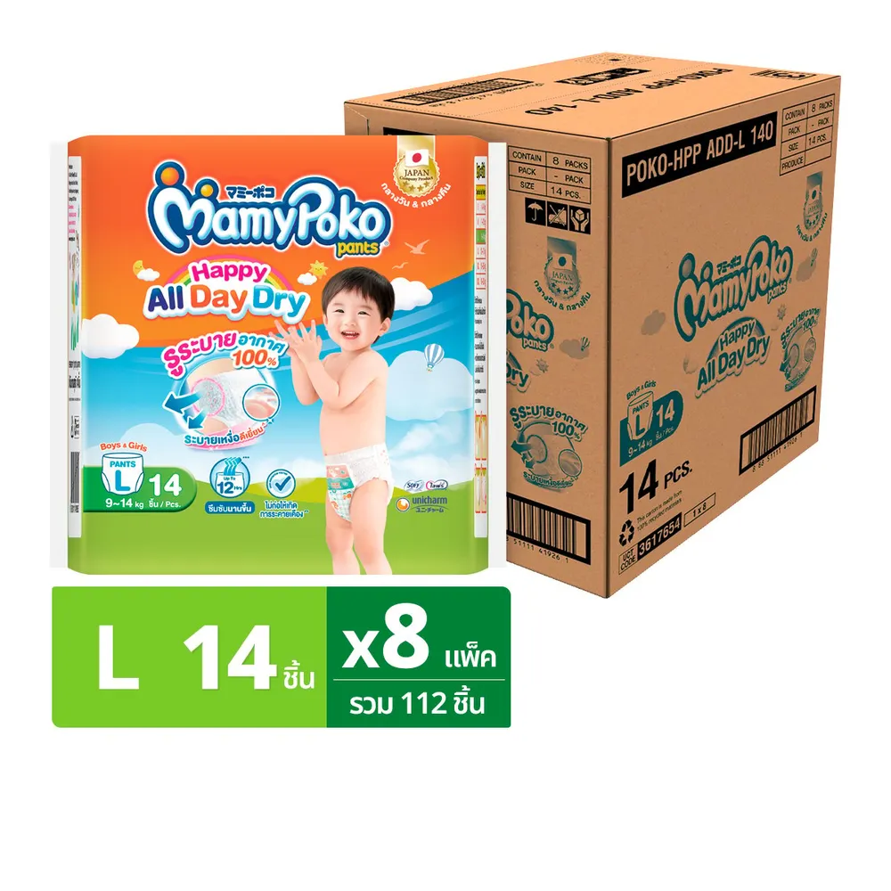 มามี่โพโค แพ้นท์ กางเกงผ้าอ้อม รุ่นแฮปปี้ ออลเดย์ดราย ขนาด L 14 ชิ้น x 8 แพ็ค