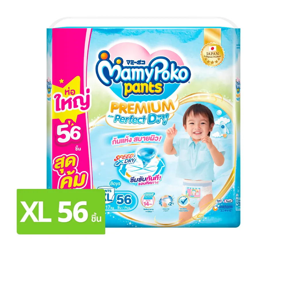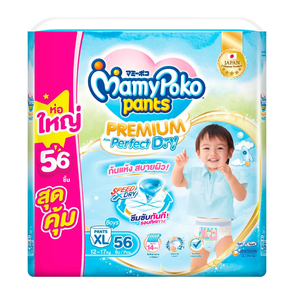 มามี่โพโค แพนท์ กางเกงผ้าอ้อม พรีเมียม เอม เพอร์เฟกต์ ดราย สำหรับเด็กชาย ขนาด XL 56 ชิ้น