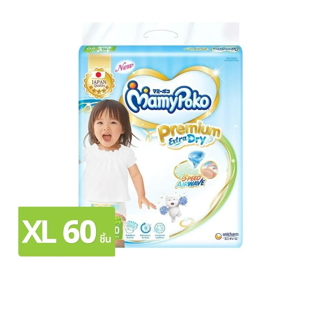มามี่โพโค พรีเมี่ยม เอ็กซ์ตร้า ดราย ผ้าอ้อมสำเร็จรูปแบบเทป ขนาด XL จำนวน 60 ชิ้น
