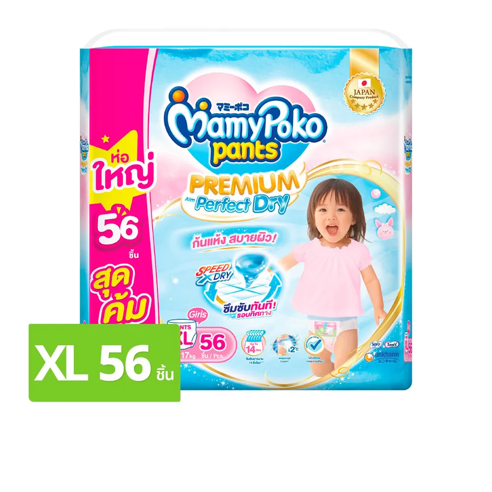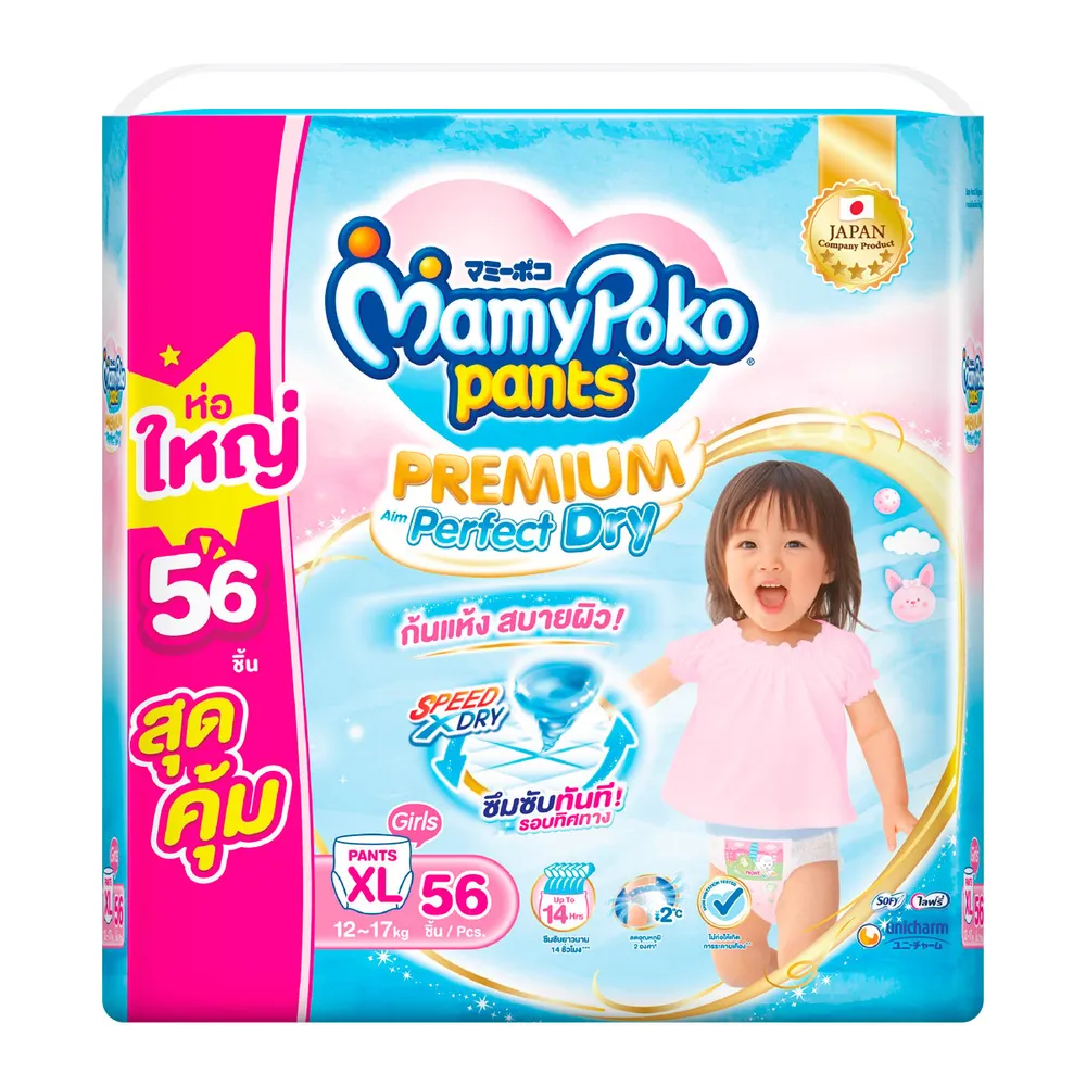 มามี่โพโค แพนท์ กางเกงผ้าอ้อม พรีเมียม เอม เพอร์เฟกต์ ดราย สำหรับเด็กหญิง ขนาด XL 56 ชิ้น