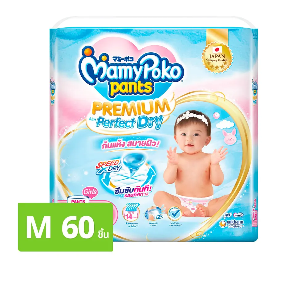 มามี่โพโค แพนท์ กางเกงผ้าอ้อม พรีเมียม เอม เพอร์เฟกต์ ดราย สำหรับเด็กหญิง ขนาด M 60 ชิ้น